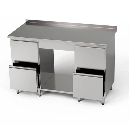Stół roboczy o wymiarach 190x70x85 cm z 2 blokami 2 szuflad i półką. Wykonany ze stali nierdzewnej J4. Półka znajduje się między blokami szuflad. Wymiary szuflady w bloku 2 szuflad: 44x46,5x44/18 cm.