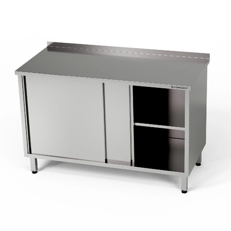 Stół roboczy o wymiarach 150x60x85 cm z szafką z drzwiami suwanymi wykonany ze stali nierdzewnej J4. Wewnątrz szafki półka.