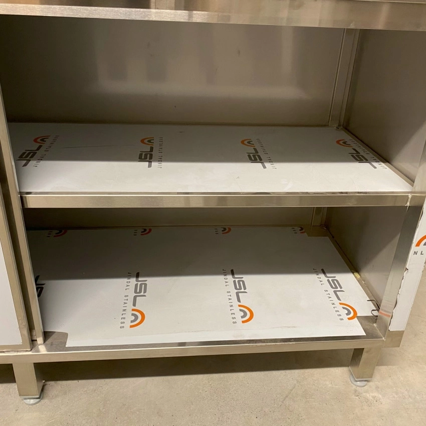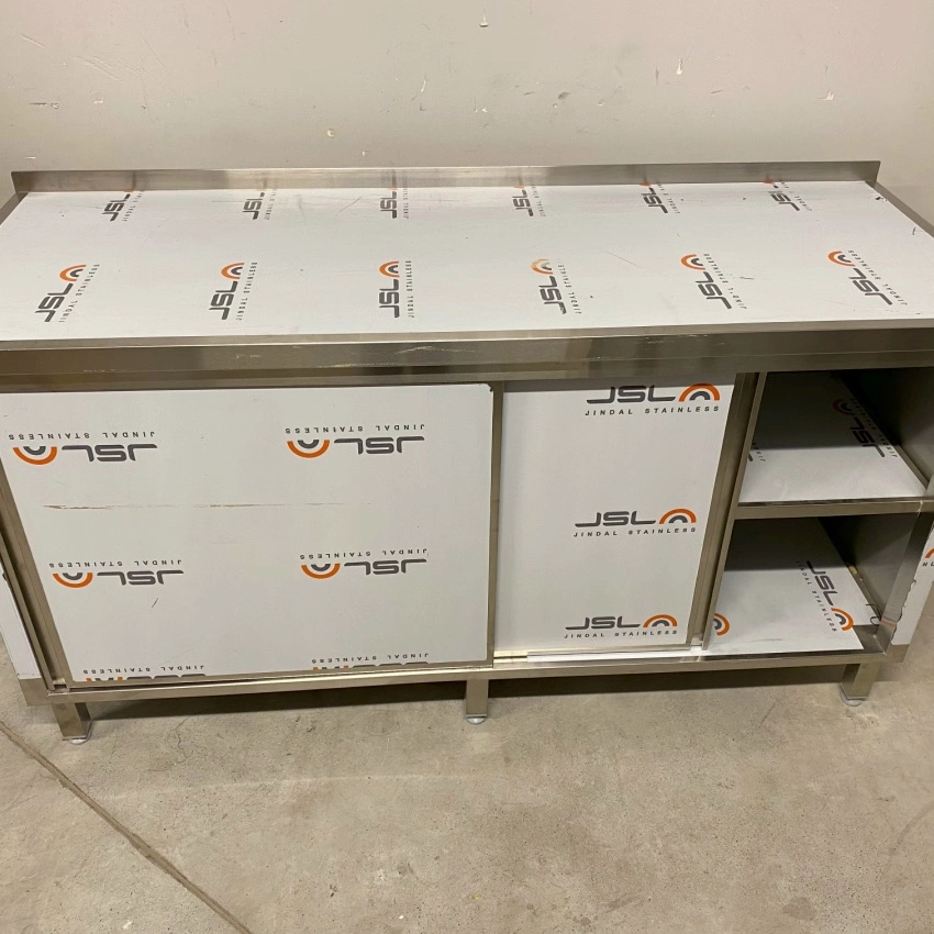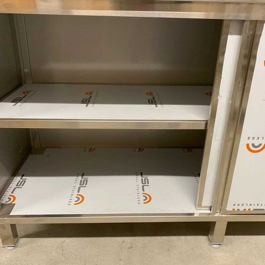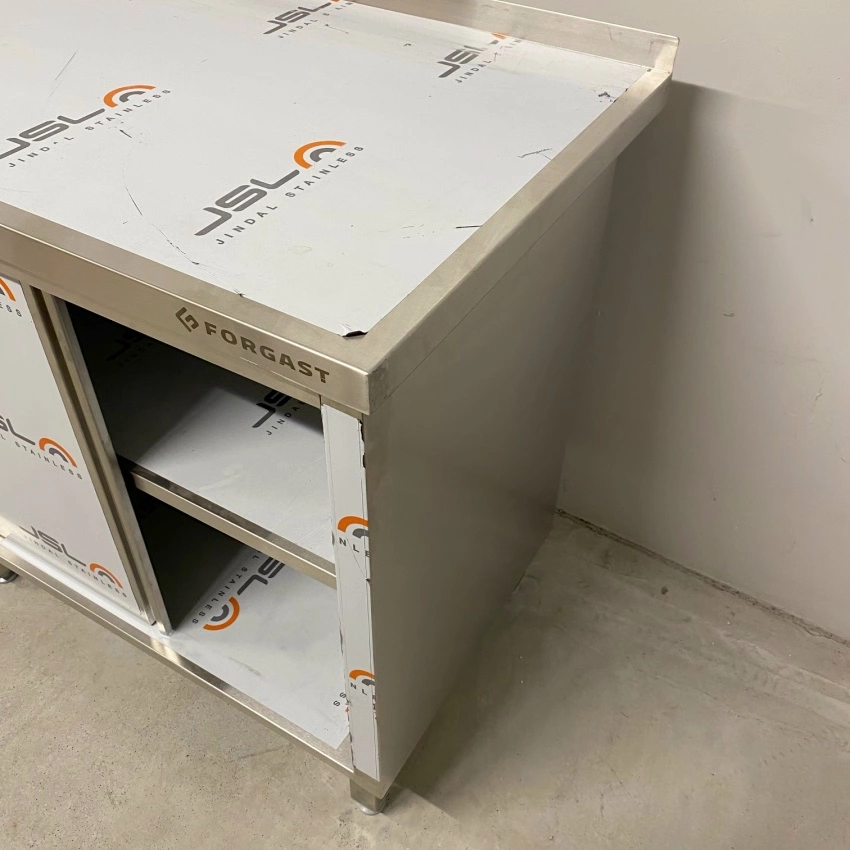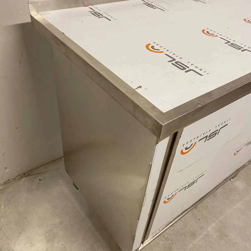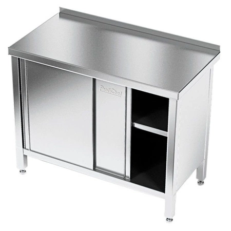 Stół roboczy E1100/1600/600 o wymiarach 160x60x85 cm z szafką z drzwiami suwanymi wykonany ze stali nierdzewnej. Wewnątrz szafki półka.