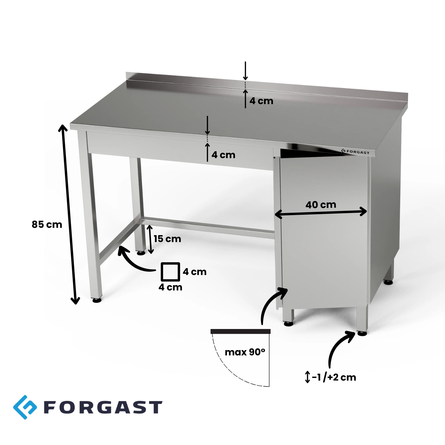 Stół roboczy z szafką z drzwiami otwieranymi o wymiarach 190x60x85 cm, wykonany ze stali nierdzewnej J4. Szafka o długości 40 cm i szerokości (głębokości) 60 cm może być usytuowana po prawej lub po lewej stronie. Wewnątrz szafki półka.