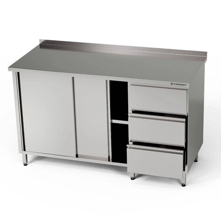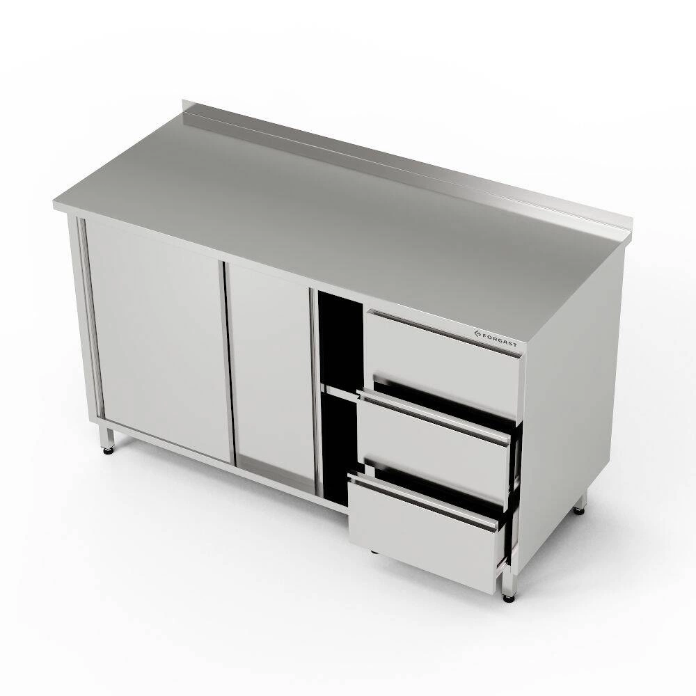 Stół roboczy o wymiarach 14x70x85 cm z blokiem 3 szuflad i szafką z drzwiami suwanymi. Wewnątrz szafki półka. Wykonany ze stali nierdzewnej J4. Szafka może być usytuowana po lewej lub prawej stronie. Wymiary szuflady w bloku 3 szuflad: 46,5x21,5x44/13 cm.