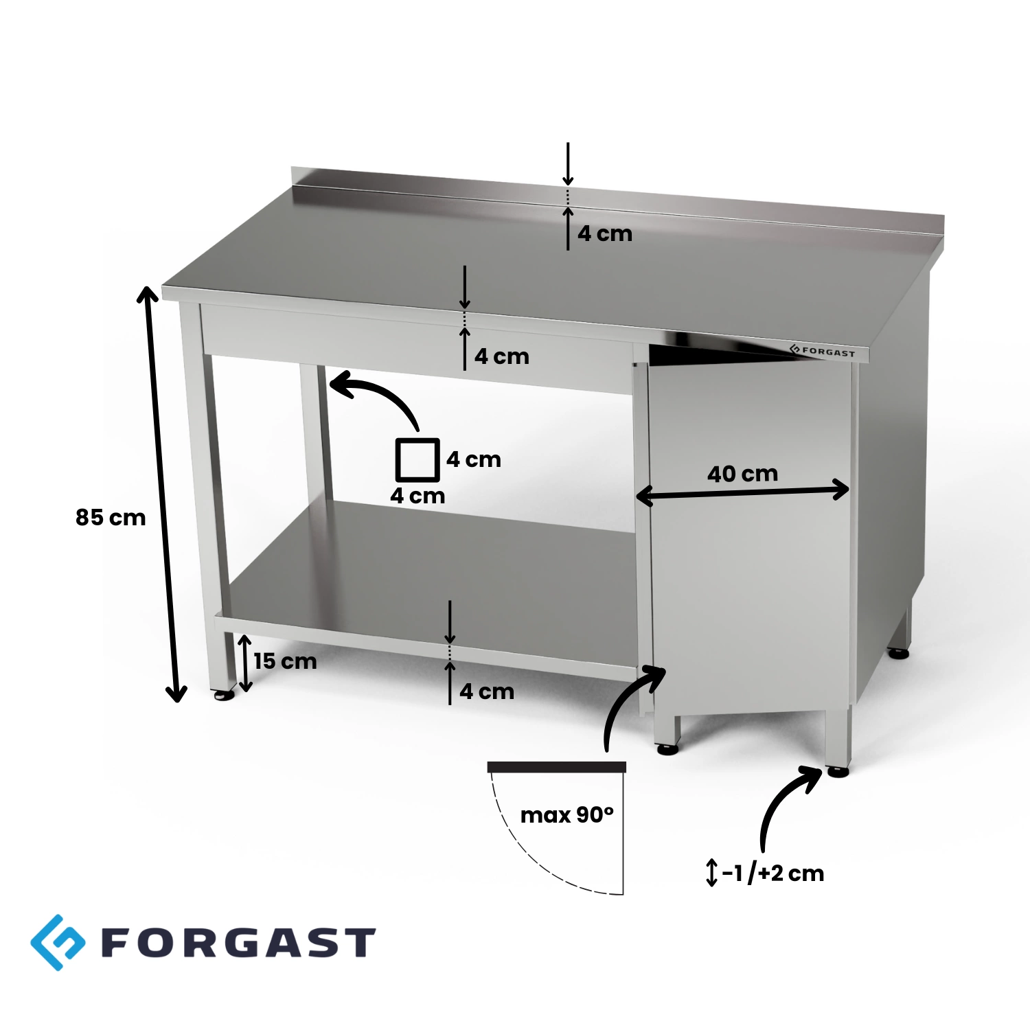 Stół roboczy o wymiarach 130x60x85 cm z szafką z drzwiami otwieranymi oraz półką dolną. Szafka o długości 40 cm i szerokości (głębokości) 60 cm usytuowana po prawej lub po lewej stronie. Wewnątrz szafki półka.