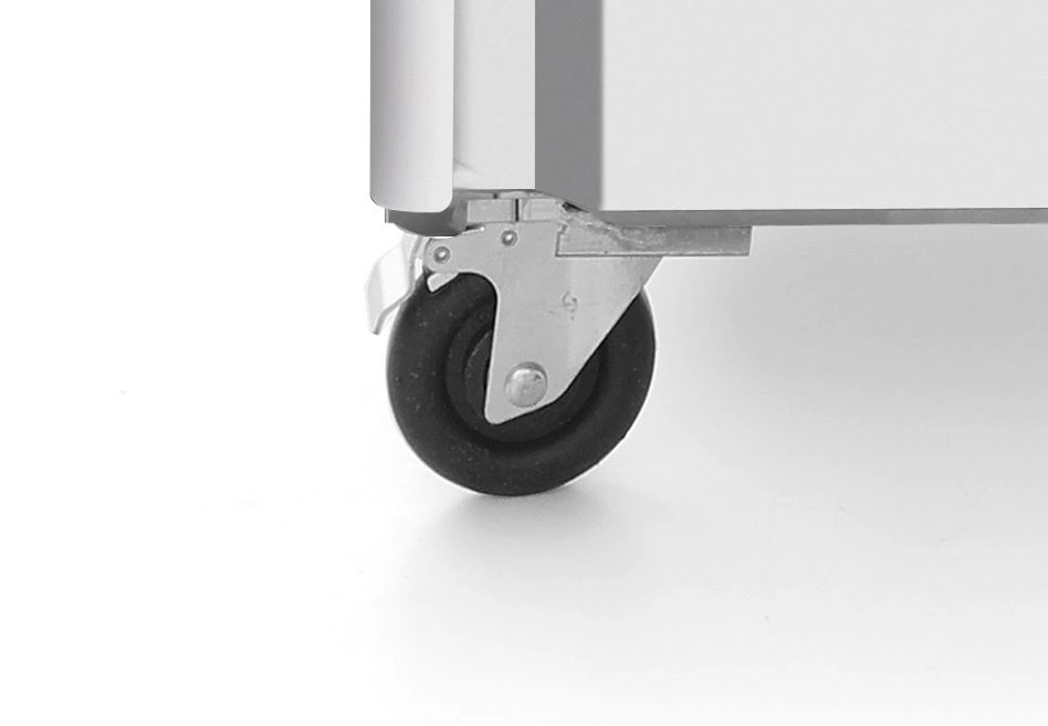 • Mobilność i bezpieczeństwo – urządzenie posiada cztery kółka, w tym dwa z hamulcami, co umożliwia łatwe przemieszczanie oraz stabilizację na miejscu. Zamek zapewnia bezpieczeństwo przechowywanych produktów.
