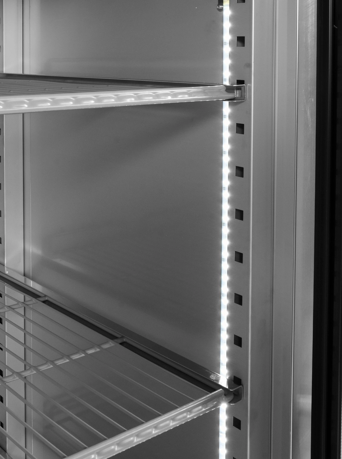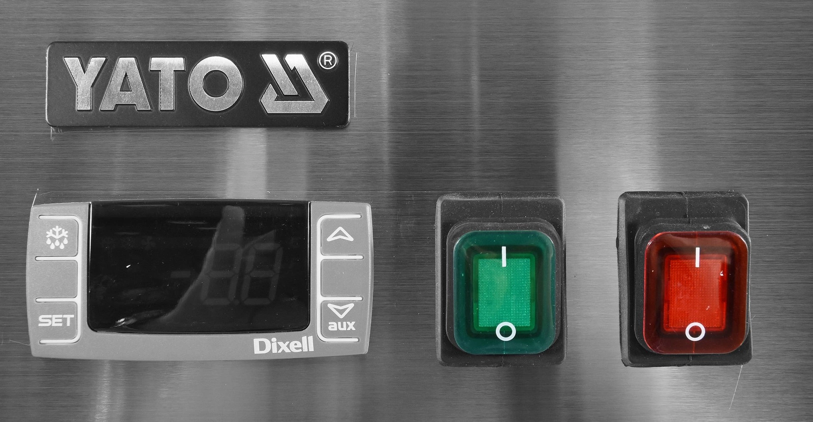 Szafa chłodnicza nierdzewna przeszklona marki YATO. Pojemność 650l. Obudowa wewnętrzna i zewnętrza wykonana ze stali nierdzewnej ss201.Samozamykające drzwi ze szkła hartowanego z zamkiem i wygodnym uchwytem do otwierania, wymienne uszczelki magnetyczne. W wyposażeniu 3 półki rusztowe powlekane PVC o nośności max 40 kg - przy równomiernym obciążeniu o wymiarach 53x63cm. Możliwość przechowywania pojemników 2/1 GN. Możliwość 22-stopniowa regulacja wysokości półek. Komora wyposażona w oświetlenie LED 12 W, sterowane niezależnie. Agregat chłodniczy górny wykorzystuje czynnik chłodniczy R290, dedykowany jest do pracy w 4 klasie klimatycznej - przy maksymalnej temperaturze otoczenia 30o C i wilgotności względnej 55%.Urządzenie posiada elektroniczny sterownik z cyfrowym wyświetlaczem temperatury. Urządzenie osadzone jest na 4 regulowanych nóżkach 14-20 cm. Szafa łatwa w utrzymaniu czystości.