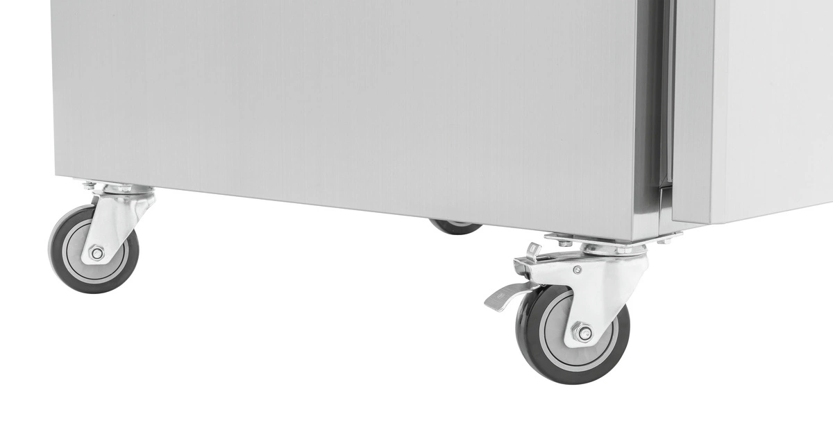 Inne cechy: 4 kółka skrętne (2 z blokadą), oświetlenie LED, funkcje kontrolne (rozmrażanie, kompresor, wentylator), brak możliwości zmiany kierunku drzwi.
