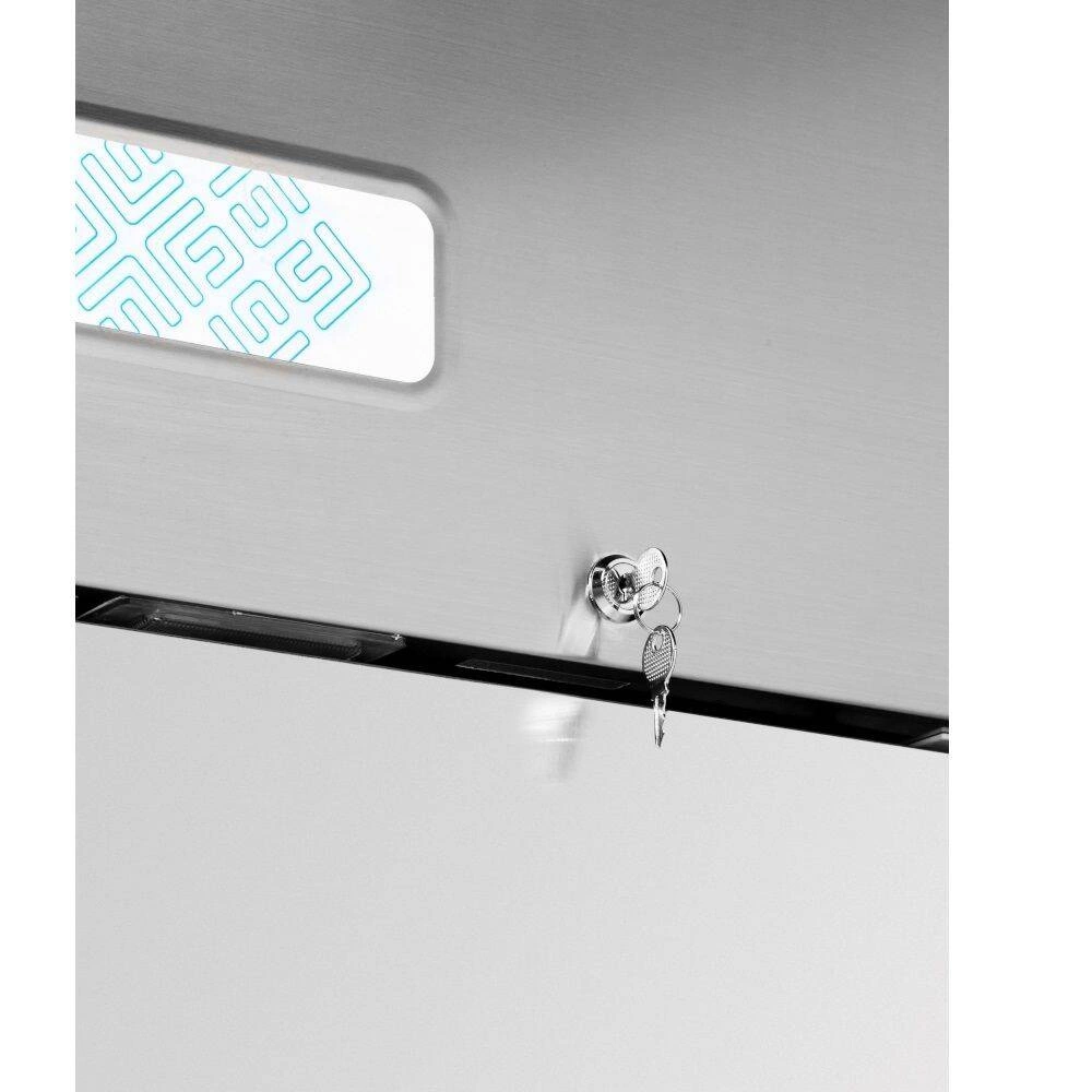 • Solidna konstrukcja ze stali nierdzewnej – Zarówno wnętrze, jak i obudowa zostały wykonane z wysokogatunkowej stali nierdzewnej AISI 304, która gwarantuje odporność na korozję i intensywną eksploatację. Zaokrąglone narożniki komory ułatwiają czyszczenie i utrzymanie higieny na najwyższym poziomie.