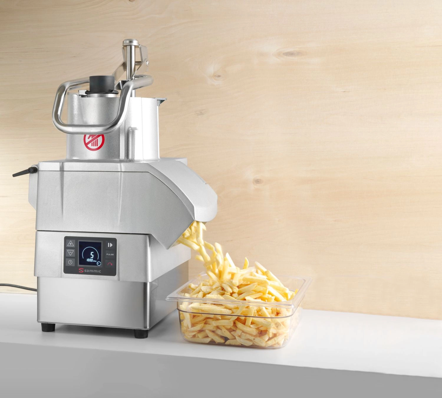 Szatkownica SAMMIC CA-4V (5 prędkości). Wykonana ze stali nierdzewnej oraz materiałów przystosowanych do kontaktu z żywnością. Przeznaczona do rozdrabniania delikatnych warzyw oraz do nadawania im różnego kształtu (dostępne tarcze). Szatkownice nadaje się również do krojenia małych główek kapusty. Mocny silnik wyposażony w technologię "Brushless". Kontrola siły krojenia. Wydajność od 200 do 650 kg. Prędkość od 300 do 1000 obr./min. Łatwa w utrzymaniu higieny, dzięki zdejmowanej pokrywie z dociskaczem. Otwór głowicy 286cm2. Profilowany dysk ewakuacyjny zwiększający wydajność szatkownicy. Boczny otwór dla pokrojonych warzyw pozwala na umieszczenie urządzenia na wąskim blacie. Blokada pracy silnika po zdjęciu pokrywy lub uniesieniu dociskacza.