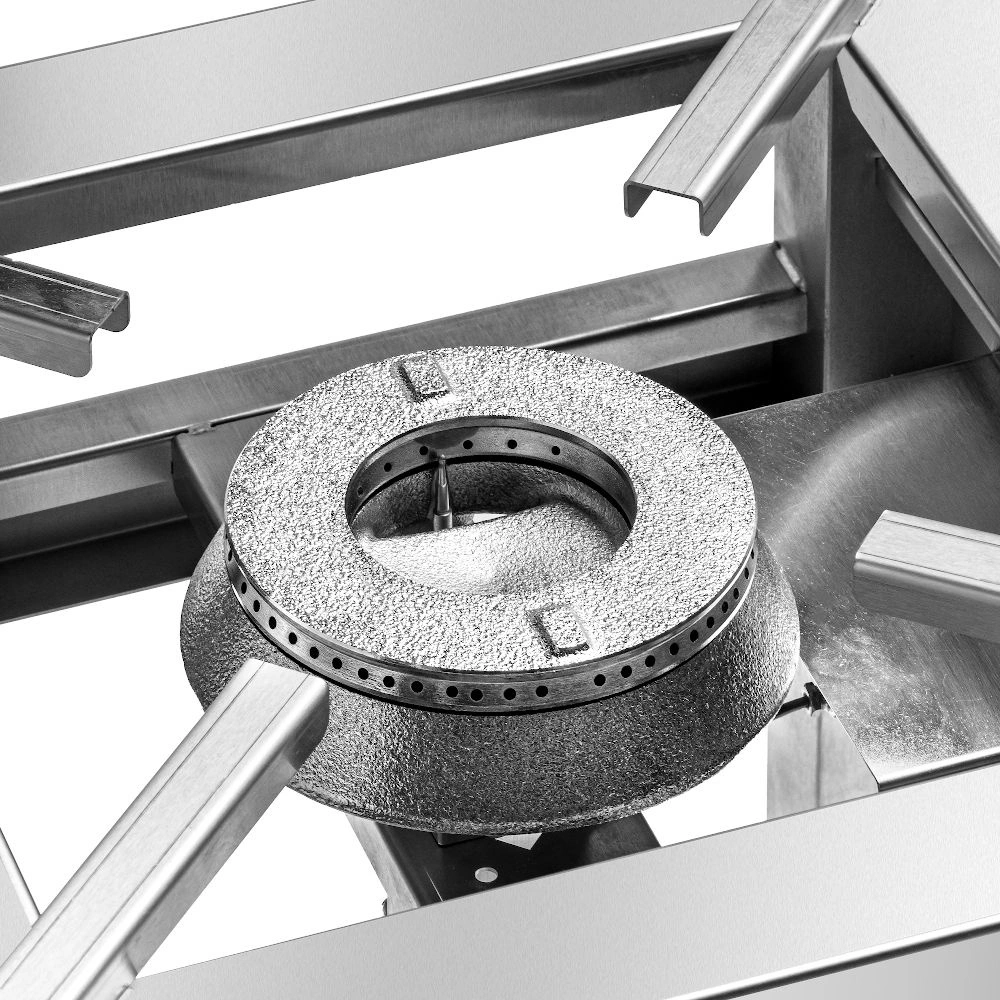 • Efektywny, dwukoronowy palnik o mocy 6,5 kW – Pozwala na szybkie zagotowanie nawet dużych ilości wody czy zup w naczyniach o pojemności do 100 litrów. Idealny do gotowania bulionów, wywarów, makaronów lub dań jednogarnkowych.