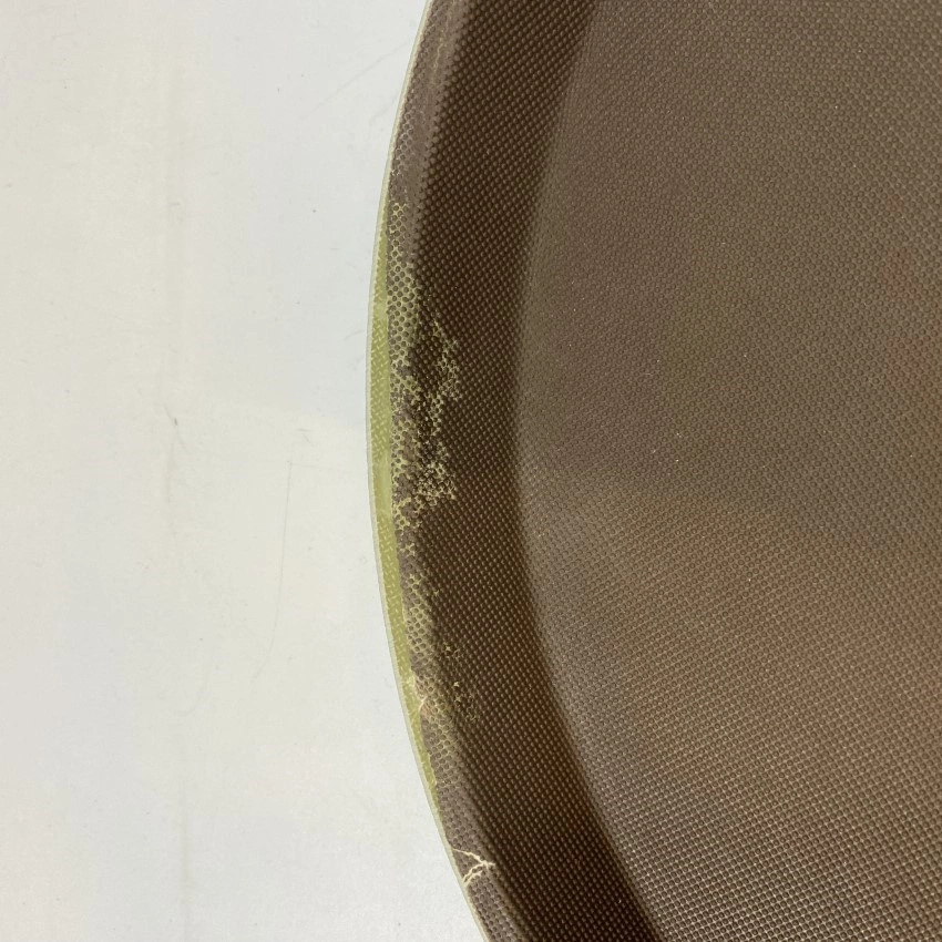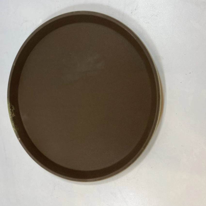 Taca kelnerska antypoślizgowa okrągła marki Forgast. średnica tacy 35 cm. Antypoślizgowa kauczukowa powierzchnia w kolorze brązowym. Spód tacy w kolorze zielonym.