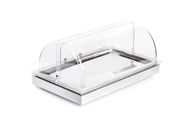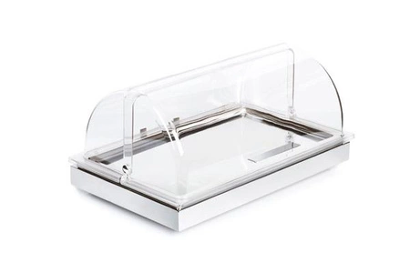 Produkt wykonany jest z wysokogatunkowej stali nierdzewnej 18/10, co zapewnia odporność na uszkodzenia oraz łatwość w czyszczeniu. Przezroczysta pokrywa roll-top umożliwia szybki podgląd zawartości i wygodne serwowanie, a jednocześnie skutecznie chroni potrawy przed wysychaniem i zabrudzeniami. Wbudowany element chłodzący gwarantuje utrzymanie optymalnej temperatury przez wiele godzin, co jest szczególnie przydatne podczas długich eventów i bufetów samoobsługowych.