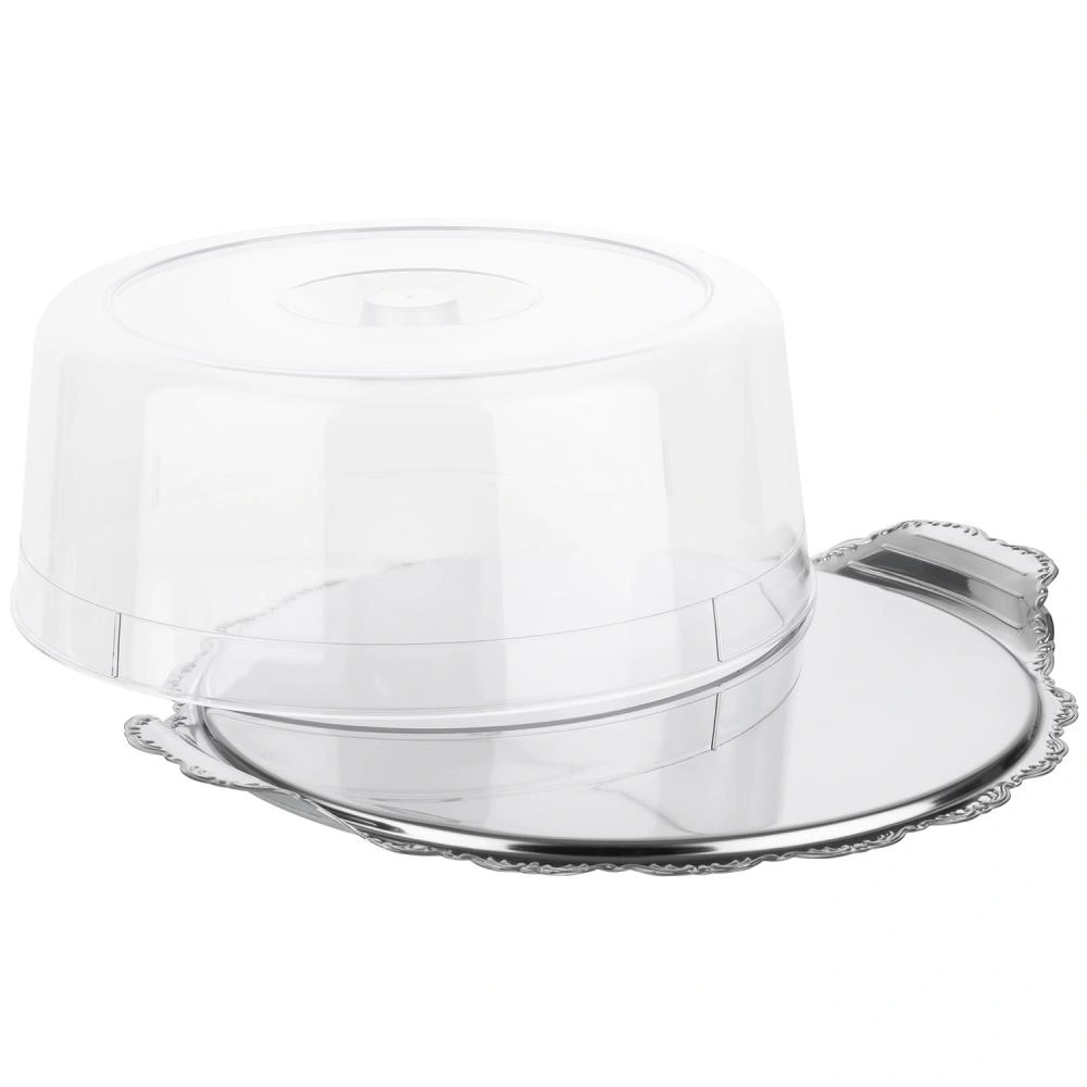 Taca wykonana jest ze stali nierdzewnej 18/0, co zapewnia jej trwałość i odporność na uszkodzenia mechaniczne. Wysoki rant sprawia, że ciasta nie zsuwają się z powierzchni podczas przenoszenia. Przezroczysta pokrywa z polistyrenu jest lekka i bardzo stabilna, łatwo ją zdejmować i zakładać, a jednocześnie umożliwia podgląd zawartości bez konieczności otwierania.