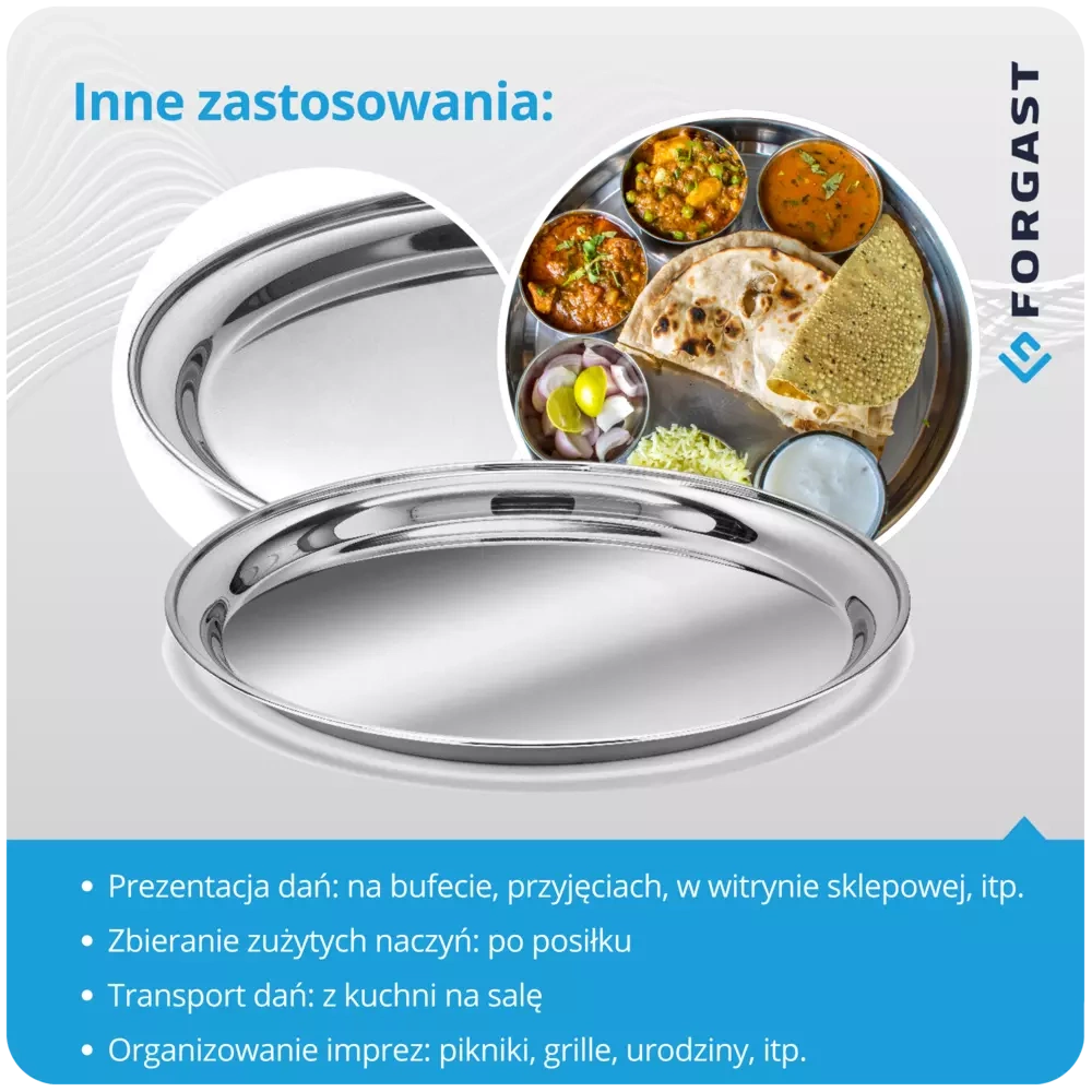 Stal nierdzewna, z której wykonano tacę, to materiał ceniony w branży gastronomicznej za swoją wytrzymałość i odporność na działanie wilgoci czy środków czyszczących. Taca zachowuje swój wygląd nawet po długotrwałym użytkowaniu i częstym myciu, zarówno ręcznym, jak i w zmywarkach przemysłowych. Okrągły kształt ułatwia równomierne rozłożenie naczyń oraz wygodne serwowanie posiłków i napojów. Taca idealnie sprawdzi się podczas obsługi dużych imprez, bankietów oraz w codziennym użytkowaniu w lokalach gastronomicznych.