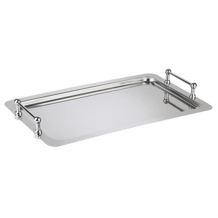 Taca systemowa GN 1/1 BUFFET STAR to profesjonalny produkt wykonany z wysokiej jakości stali nierdzewnej, przeznaczony do wykorzystania w bufetach, restauracjach oraz podczas obsługi cateringowej. Charakteryzuje się solidną konstrukcją i estetycznym wykończeniem, co sprawia, że doskonale sprawdzi się zarówno podczas serwowania potraw, jak i prezentacji dań na stole. Dzięki chromowanym uchwytom taca jest wygodna w użytkowaniu i łatwa w transporcie.