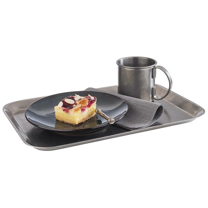 - Antyczny design: Wykończenie stali nierdzewnej w stylu vintage nadaje tacy oryginalny, ponadczasowy wygląd, który przyciąga wzrok i pasuje do klasycznych oraz nowoczesnych wnętrz.
