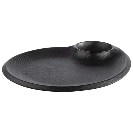 Talerz NERO z miseczką na dipy to nowoczesne naczynie prezentacyjne, które doskonale sprawdzi się zarówno w restauracjach, jak i w domowych aranżacjach stołu. Wyróżnia się eleganckim, czarnym kolorem, praktycznym wgłębieniem na dipy oraz trwałym materiałem wykonania. Idealnie nadaje się do podawania przekąsek, przystawek lub dań wymagających osobnych sosów.