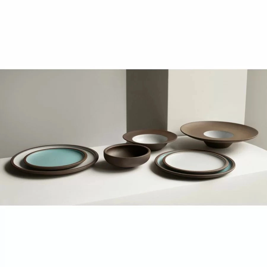 Talerz płaski VERLO z linii CHOCO to doskonałe połączenie elegancji i finezji kolorów, które wzbogaci każde nakrycie stołu. Szafirowy błękit idealnie kontrastuje z matowym, czekoladowym brązem zewnętrznej części talerza. Wyraźnie zarysowany, płaski rant w brązowym odcieniu nie tylko dodaje uroku, ale także podkreśla subtelne barwy porcelany, tworząc harmonijną całość. Talerz ten cechuje prosta, ale wyrafinowana forma, która doskonale sprawdzi się zarówno w codziennym użytkowaniu, jak i w eleganckich aranżacjach stołowych. Dzięki ręcznemu wykończeniu każdy egzemplarz zyskuje unikalny charakter, co czyni tę porcelanę wyjątkową.
