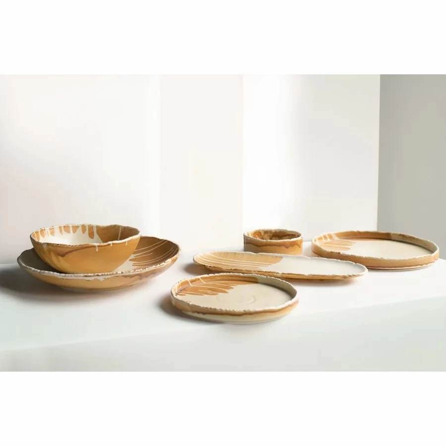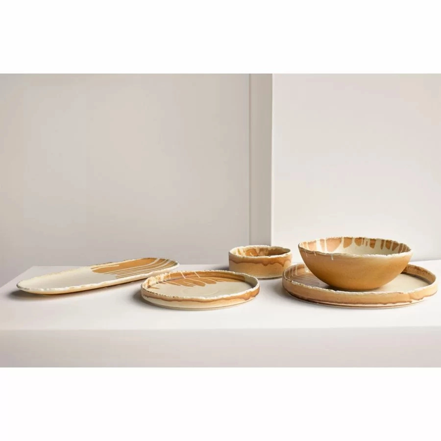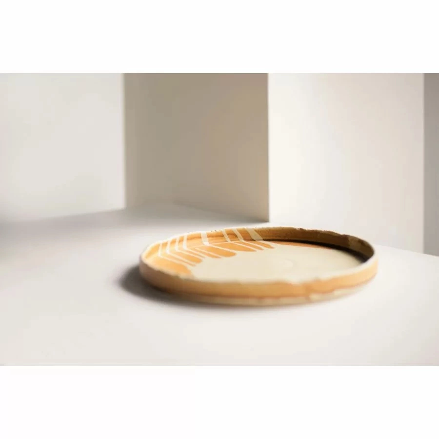 Talerz płaski VERLO z linii SAMTO to wyraz wyjątkowej elegancji i artystycznego wyrafinowania. Połączenie dwóch kontrastujących struktur – surowej, lekko chropowatej powierzchni w rdzawym odcieniu oraz gładkiego, waniliowo-białego wnętrza – nadaje talerzowi unikalny, rustykalny charakter. Dzięki subtelnym wypukłościom i nieregularnie wykończonym rantom każdy egzemplarz wyróżnia się swoją indywidualnością, przypominając rękodzieło o nowoczesnym sznycie. Jest to idealny wybór do serwowania dań głównych, śniadań czy deserów, podkreślając piękno i smak serwowanych potraw. Matowe wykończenie i szkliwo reaktywne nadają mu subtelnej elegancji, a ręczne wykończenie sprawia, że każda sztuka różni się delikatnie w kolorystyce i fakturze, nadając zastawie wyjątkowego uroku.