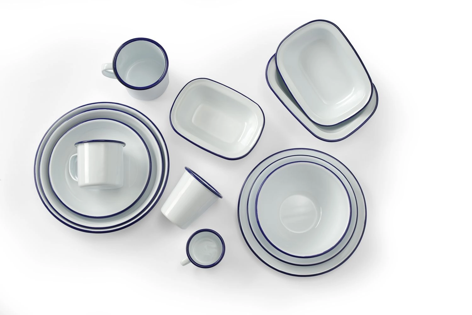 Talerz płytki o średnicy 24 cm. Wykonany z wysokiej jakości stali pokrytej białą emalią z niebieskim brzegiem. Możliwość piętrowania, Można myć w zmywarkach. Nie można używać w kuchenkach mikrofalowych.