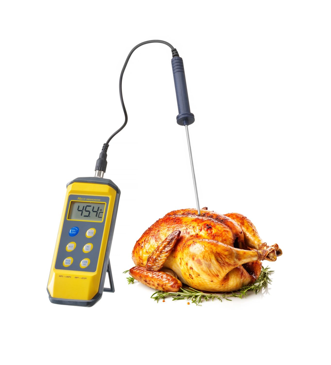 Termometr cyfrowy z wymienną sondą. Wodoszczelny. Ochronny futerał z tworzywa. Zakres temperatury od -50 do +300oC. Wyłącznie do mierzenia temperatury żywności.