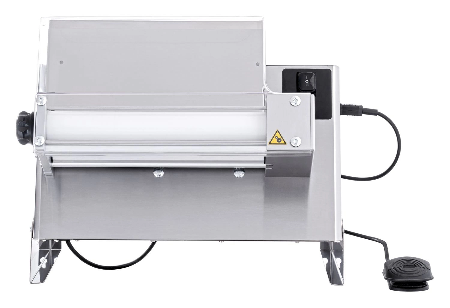 Elektryczne urządzenie do formowania pizzy (wałkownica) wykonane ze stali nierdzewnej. Elektryczny przycisk nożny. Urządzenie idealne do wałkowania zimnego ciasta na pizzę, pierogi i makaron.