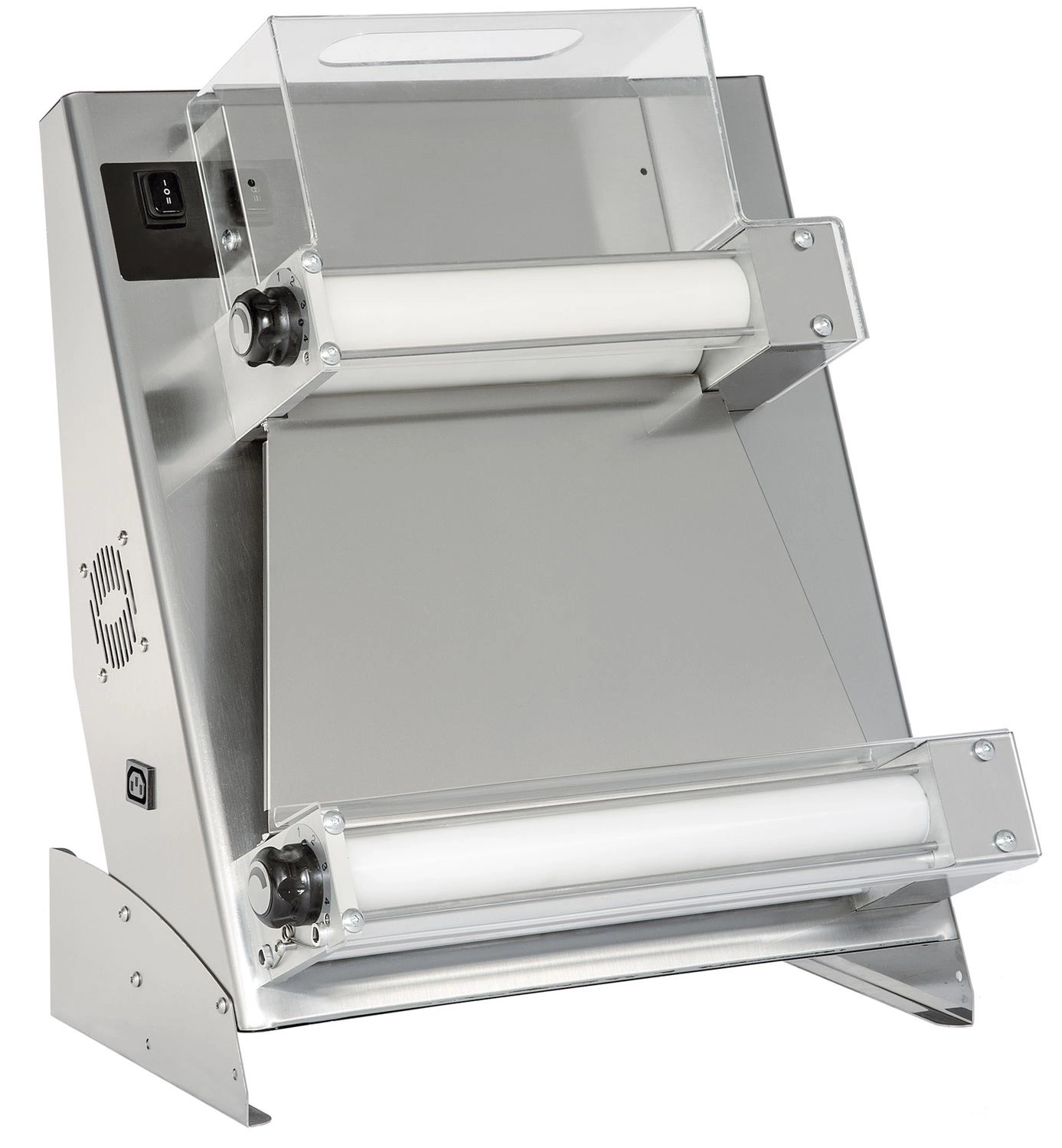 Dwie pary regulowanych wałków umożliwiają ustawienie grubości ciasta od 0 do 4 mm i nadanie mu okrągłego kształtu. Można formować pizze o średnicy od 26 do 45 cm.