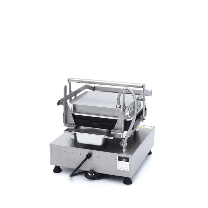 Dodatkowo urządzenie wyposażono w wyjmowaną tacę ociekową, którą można myć w zmywarce, oraz solidny uchwyt zapewniający bezpieczną obsługę. Cztery antypoślizgowe nóżki ze stali nierdzewnej gwarantują stabilność podczas pracy, nawet przy intensywnym użytkowaniu. Warto pamiętać, że formy do wypieku należy dokupić osobno, co daje możliwość wyboru najbardziej odpowiadających kształtów.