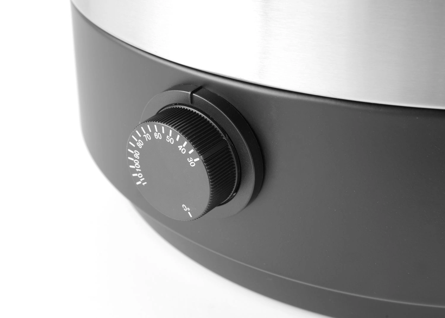 - Precyzyjna regulacja temperatury – termostat umożliwia ustawienie temperatury do 110°C, co pozwala na wygodne utrzymanie odpowiedniej temperatury serwowania.