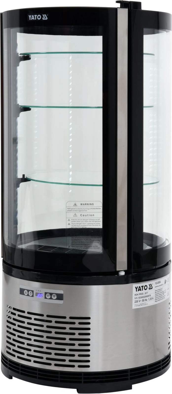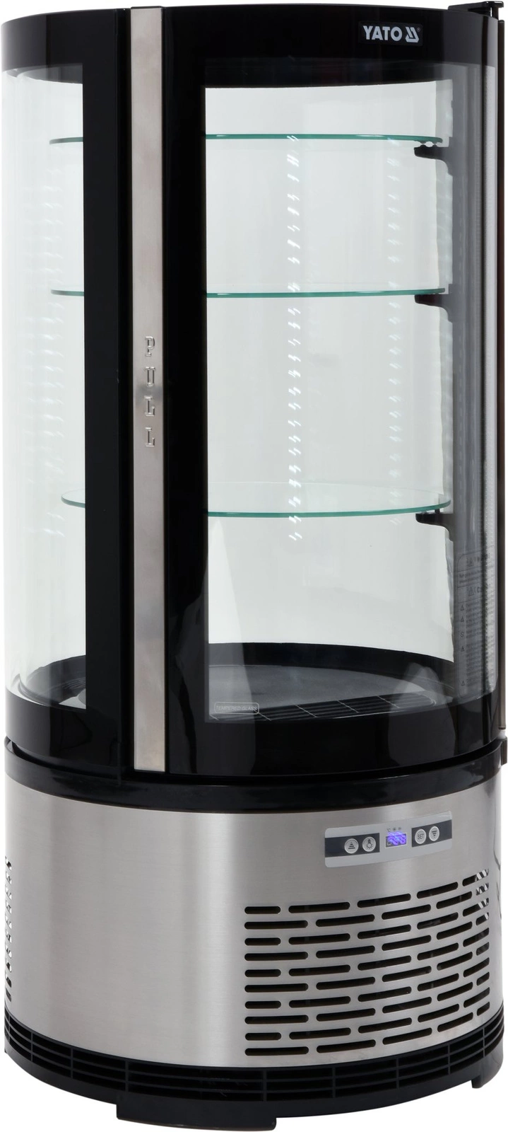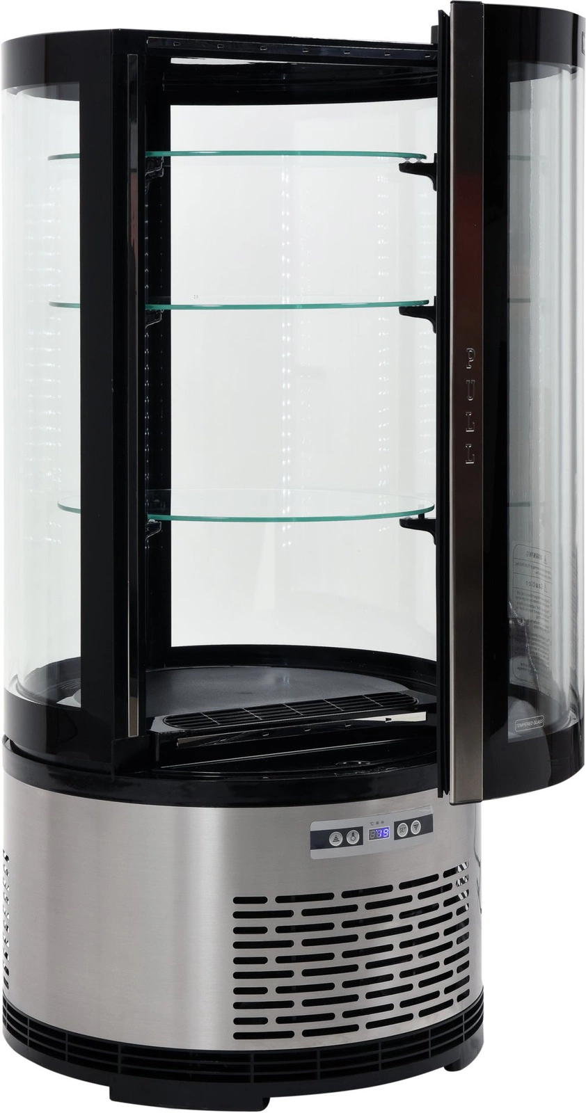 Witryna chłodnicza okrągła nadstawna o pojemności 100 l. Wykonana z wysokiej jakości surowców. Idealna do eksponowania tortów i ciast. W wyposażeniu 3 półki z szkła hartowanego o regulowanej wysokości. Dostęp do środka witryny odbywa się za pomocą drzwiczek szklanych ze szkła hartowanego z funkcją samo-zamykania. Witryna posiada oświetlenie LED. Agregat chłodniczy wykorzystuje czynnik chłodniczy 600a. Urządzenie posiada elektroniczny sterownik z cyfrowym wyświetlaczem temperatury.