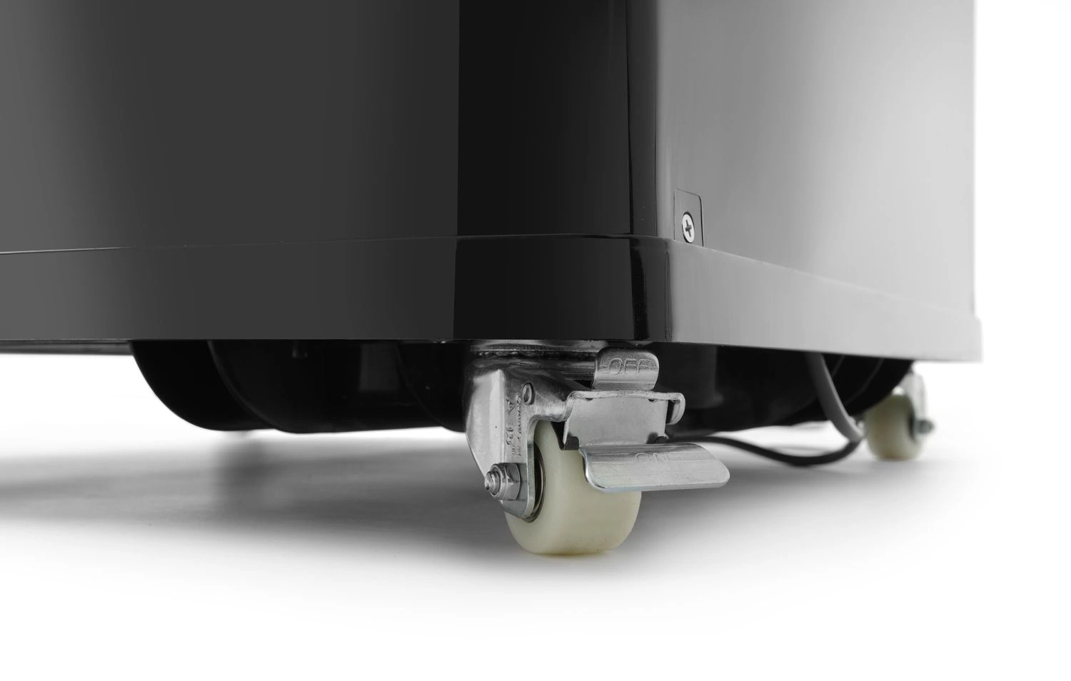 Obudowa witryny wykonana jest z czarnej, malowanej stali nierdzewnej, co gwarantuje trwałość i łatwość utrzymania w czystości. Drzwi z podwójną szybą są nie tylko estetyczne, ale również funkcjonalne – łatwe do otwarcia, odporne na uszkodzenia i zaprojektowane tak, by minimalizować ryzyko osadzania się pary wodnej. Przestawne półki pozwalają na indywidualną aranżację przestrzeni chłodniczej, a zamontowane kółka ułatwiają relokację urządzenia.