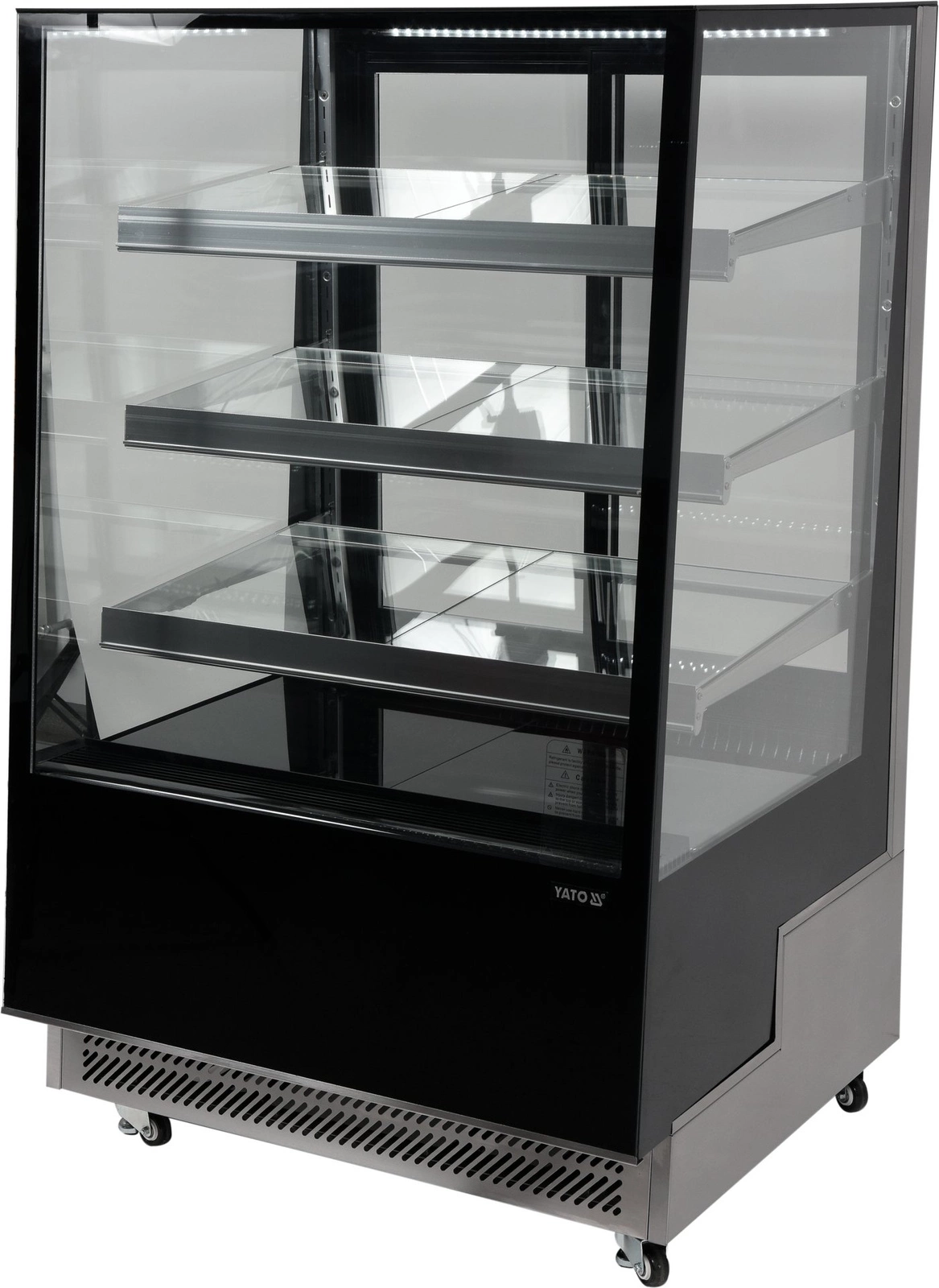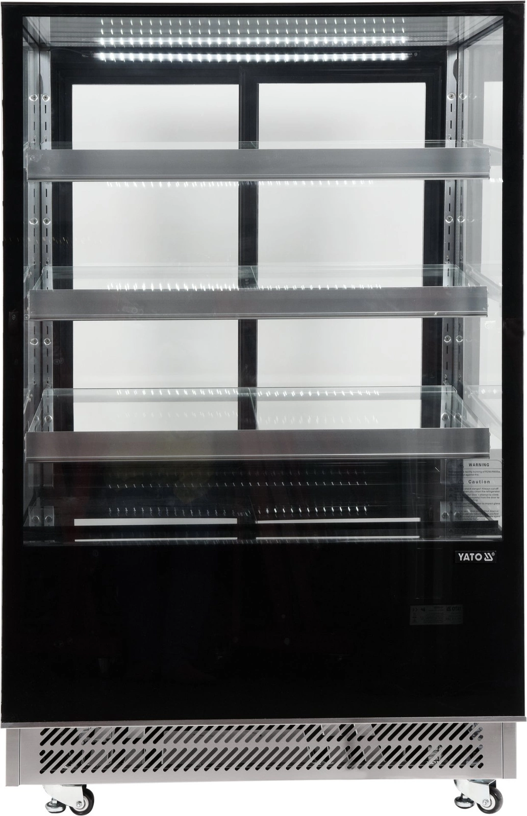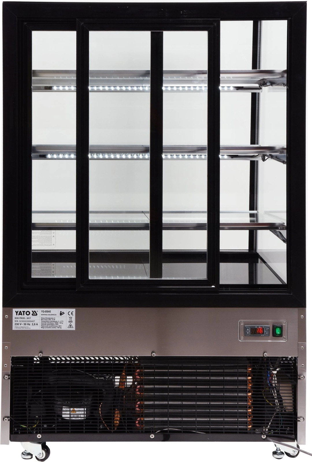 Witryna chłodnicza o pojemności 400 l. Wykonana z wysokiej jakości surowców. Idealna do eksponowania produktów tj. ciasta, torty, mini przekąski czy różnego radzaju smoothie. W wyposażeniu trzy półki szklane z możliwością regulacji położenia co daje możliwość układania produktów o różnych gabarytach Dostęp do środka witryny odbywa się za pomocą drzwiczek, które wykonane są z dwuwarstwowych szyb hartowanych tak jak i szyba frontowa oraz boczne. Witryna posiada oświetlenie LED montowane pod spodem każdej z półek. Agregat chłodniczy wykorzystuje czynnik chłodniczy R290. Urządzenie posiada elektroniczny sterownik z cyfrowym wyświetlaczem temperatury. Dodatkowo witryna posiada włącznik zasilania, który umożliwia uruchamianie lub wyłączanie w każdym momencie bez konieczności odłączania od zasilania. Witryna posiada 4 kółka, dzięki którym przestawienie jej jest proste i szybkie. Dodatkowo posiada 4 wykręcane nóżki, którą ją stabilizują oraz umożliwiają wypoziomowanie jej.