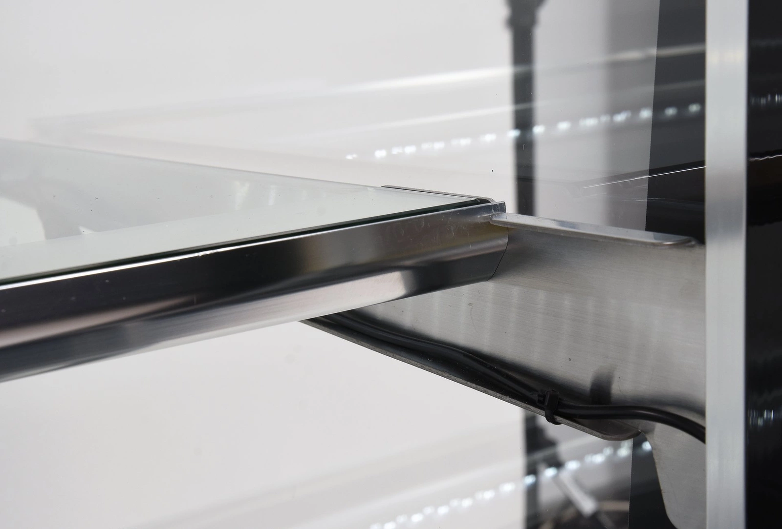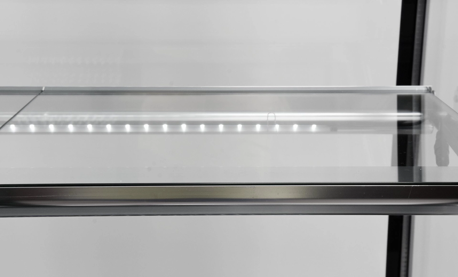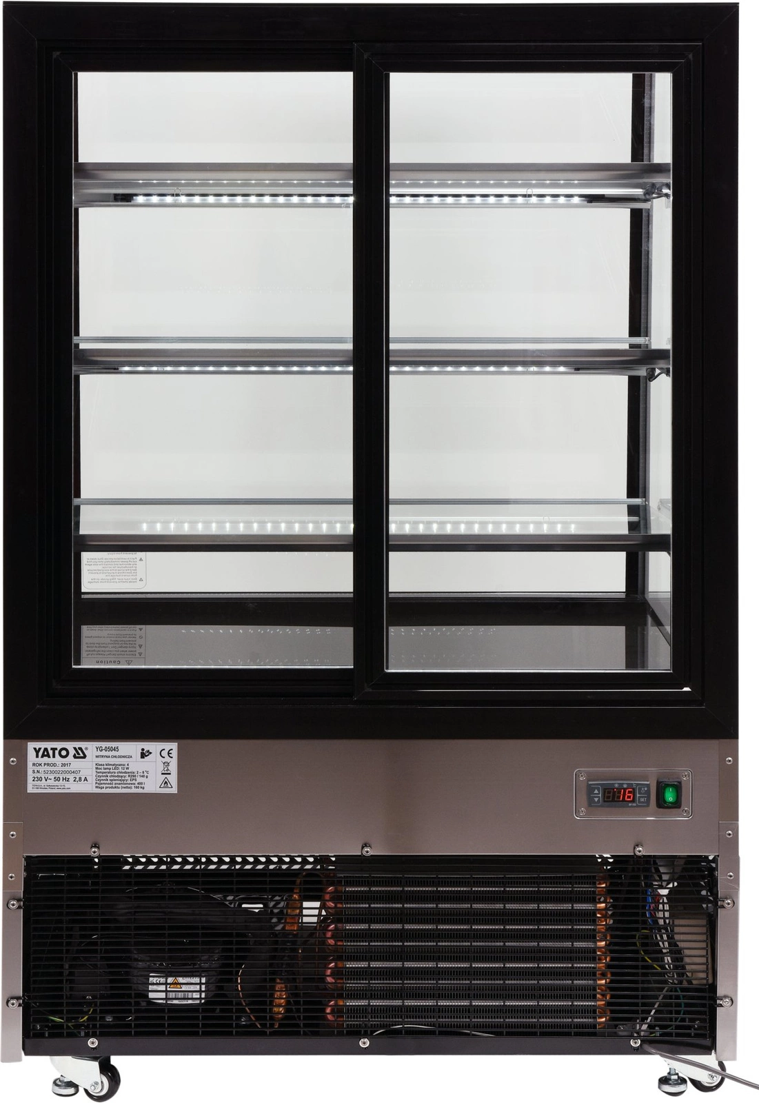 Witryna chłodnicza o pojemności 400 l. Wykonana z wysokiej jakości surowców. Idealna do eksponowania produktów tj. ciasta, torty, mini przekąski czy różnego radzaju smoothie. W wyposażeniu trzy półki szklane z możliwością regulacji położenia co daje możliwość układania produktów o różnych gabarytach Dostęp do środka witryny odbywa się za pomocą drzwiczek, które wykonane są z dwuwarstwowych szyb hartowanych tak jak i szyba frontowa oraz boczne. Witryna posiada oświetlenie LED montowane pod spodem każdej z półek. Agregat chłodniczy wykorzystuje czynnik chłodniczy R290. Urządzenie posiada elektroniczny sterownik z cyfrowym wyświetlaczem temperatury. Dodatkowo witryna posiada włącznik zasilania, który umożliwia uruchamianie lub wyłączanie w każdym momencie bez konieczności odłączania od zasilania. Witryna posiada 4 kółka, dzięki którym przestawienie jej jest proste i szybkie. Dodatkowo posiada 4 wykręcane nóżki, którą ją stabilizują oraz umożliwiają wypoziomowanie jej.