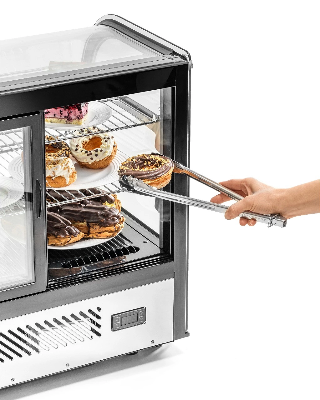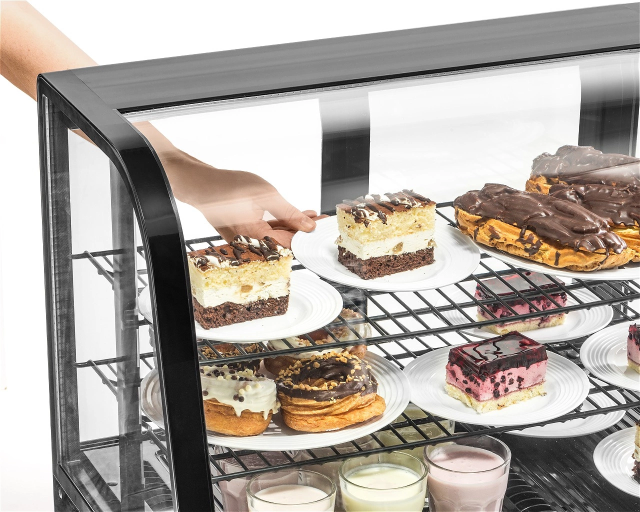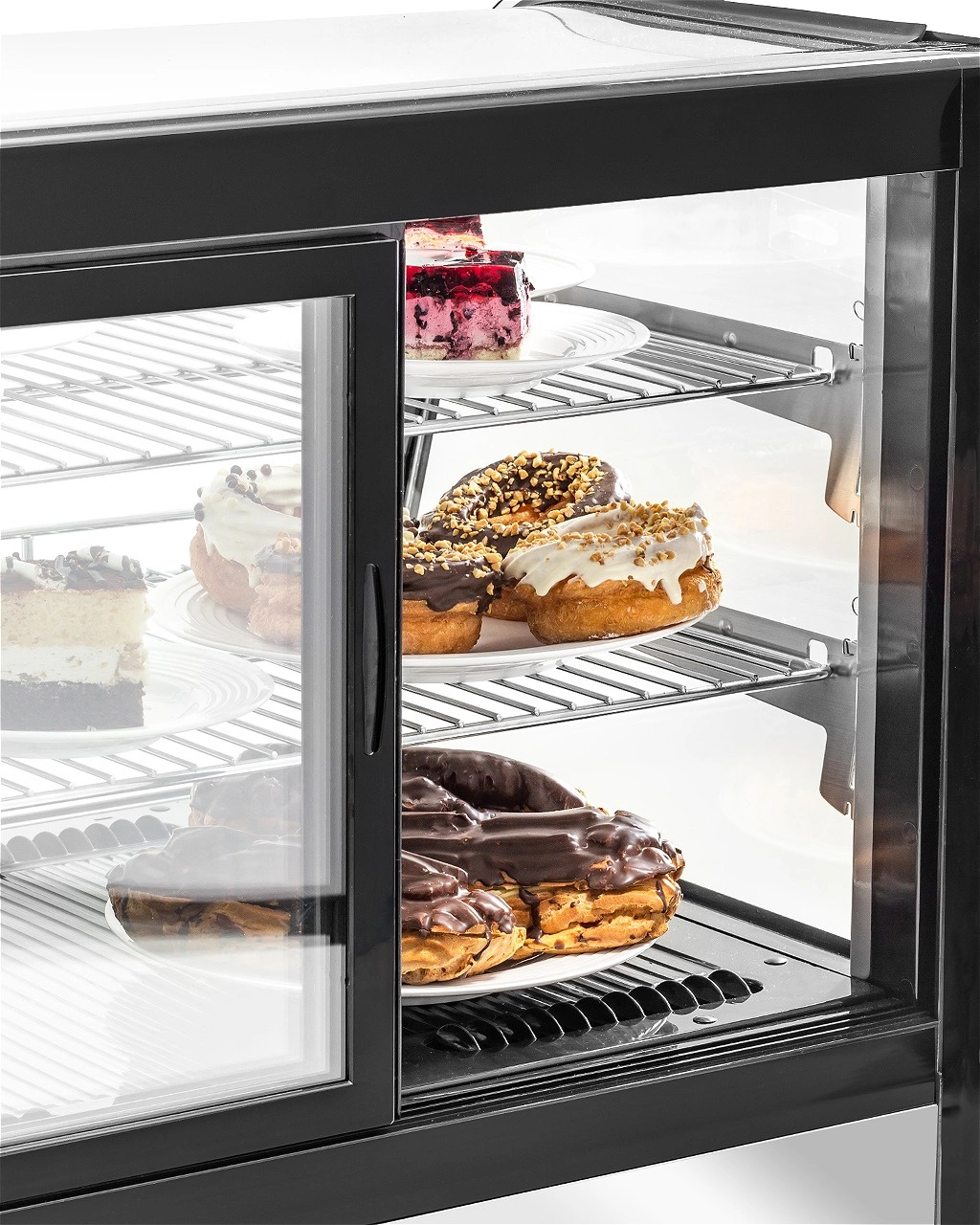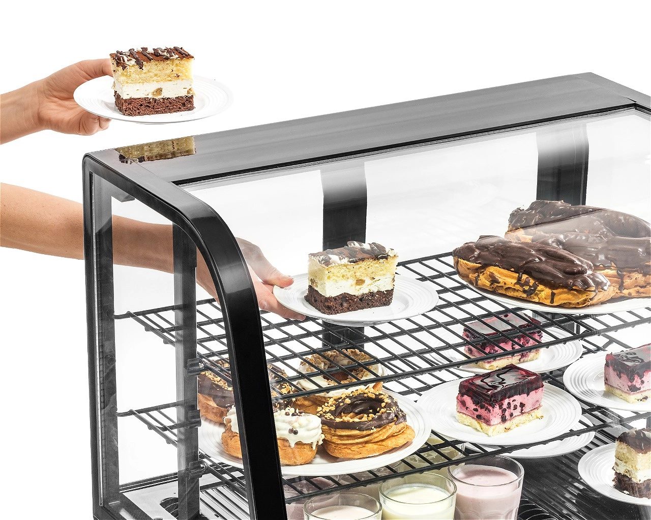 - Przeszklona obudowa – umożliwia prezentację produktów z każdej strony, co przyciąga uwagę klientów i zachęca do zakupu. Idealnie sprawdzi się do eksponowania ciast, deserów, napojów czy kanapek.