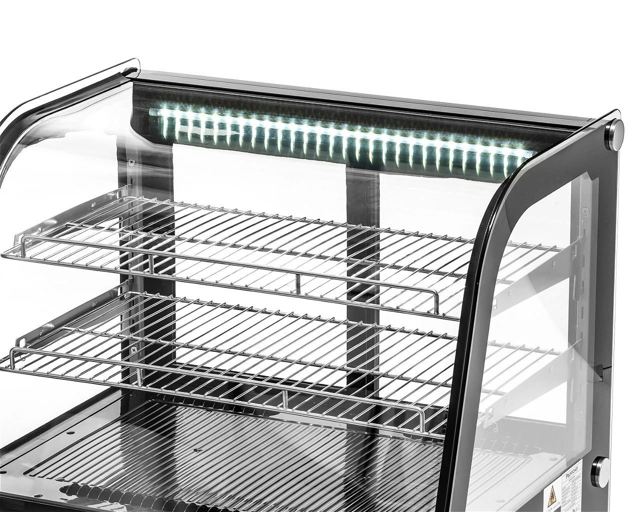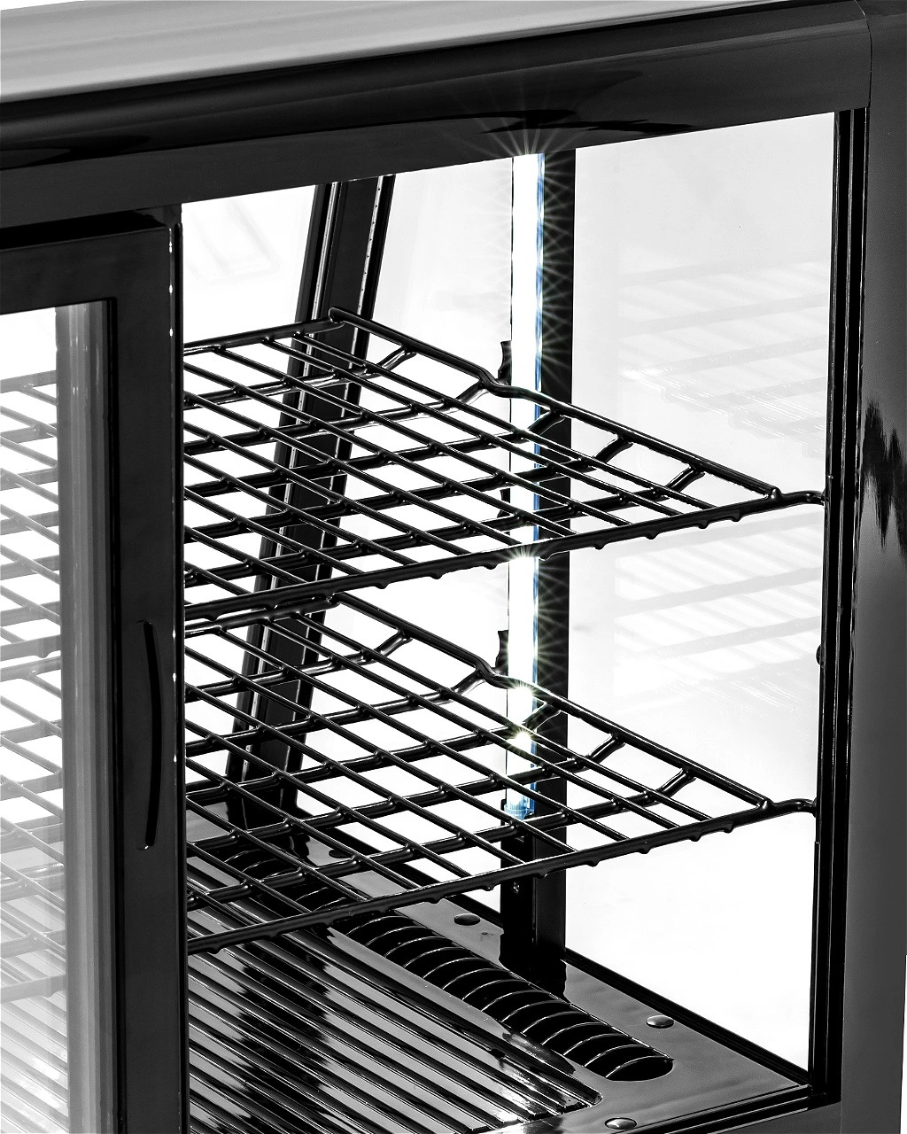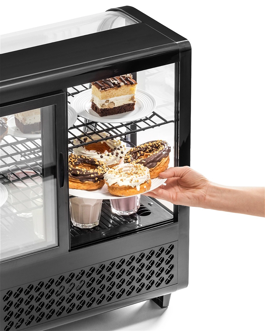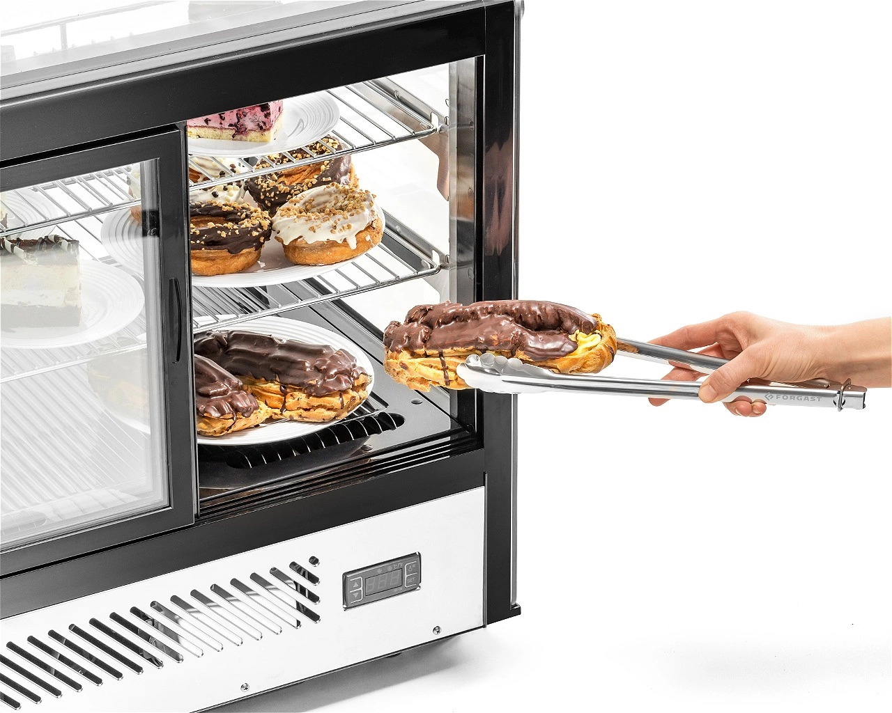 - Przeszklona obudowa – umożliwia prezentację produktów z każdej strony, co przyciąga uwagę klientów i zachęca do zakupu. Idealnie sprawdzi się do eksponowania ciast, deserów, napojów czy kanapek.