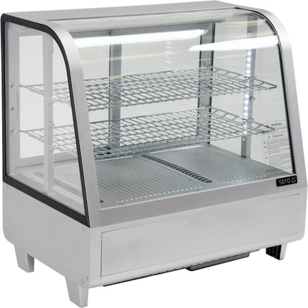 Witryna chłodnicza ekspozycyjna przeszklona z 4 stron o pojemności 100 l. Kolor srebrny. Wykonana z wysokiej jakości surowców. Idealna do eksponowania produktów tj. ciasta, torty, mini przekąski. W wyposażeniu dwie powlekane półki z możliwością regulacji położenia co daje możliwość układania produktów o różnych gabarytach .Dostęp do środka witryny odbywa się za pomocą przesuwnych drzwiczek szklanych, które wykonane są ze szkła hartowanego, podobnie jak zaokrąglona przednia szyba oraz boczne - dzięki temu są bardzo wytrzymałe i mają dobre właściwości izolujące. Witrynka posiada oświetlenie LED co pozwala na jeszcze ładniejszą ekspozycję produktów.