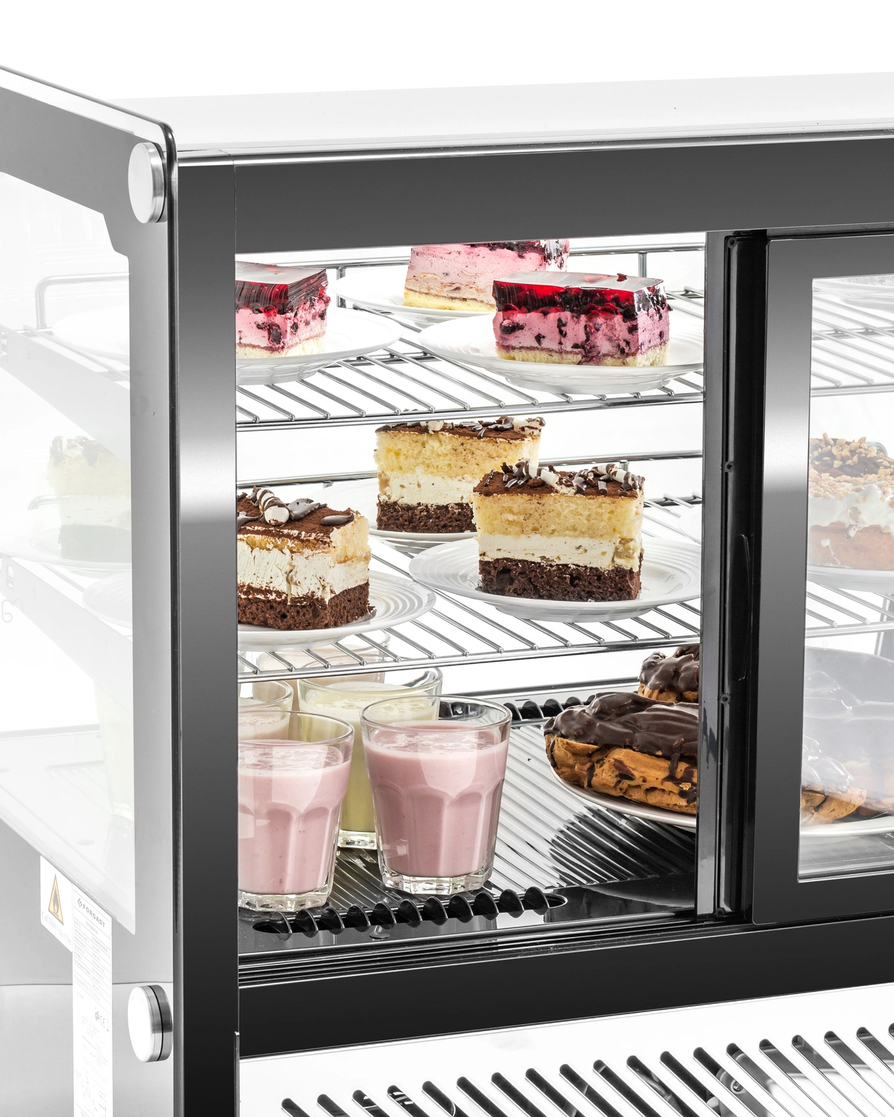- Pojemność: 120 l – przestrzeń ekspozycyjna umożliwia prezentację szerokiej gamy produktów spożywczych, takich jak ciasta, przekąski czy napoje.