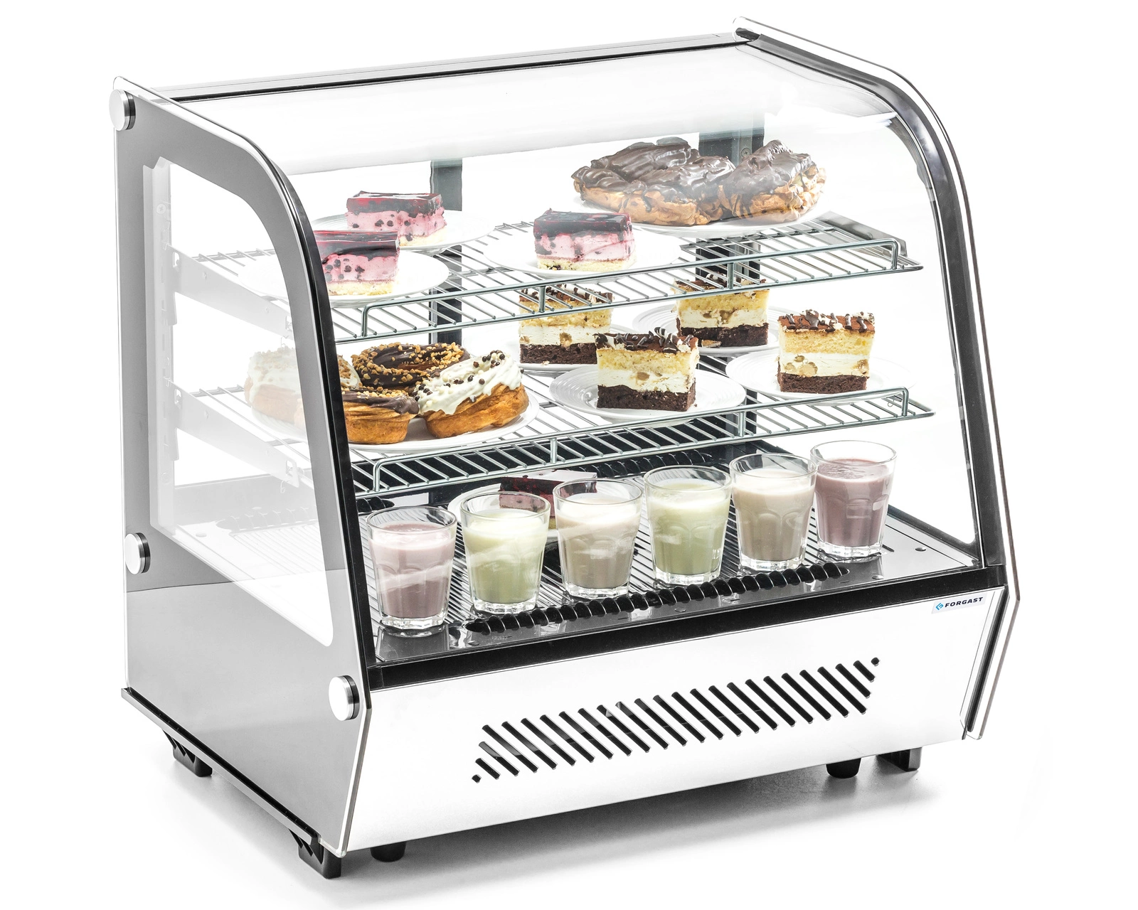 Witryna ekspozycyjna chłodnicza przeszklona 120 l FORGAST FG07711 to profesjonalne urządzenie chłodnicze przeznaczone do prezentacji i przechowywania produktów spożywczych w punktach gastronomicznych. Charakteryzuje się pojemną komorą ekspozycyjną, dynamicznym systemem chłodzenia oraz energooszczędnym oświetleniem LED. Idealnie sprawdzi się w restauracjach, cukierniach, kawiarniach oraz wszędzie tam, gdzie liczy się atrakcyjna prezentacja żywności oraz zachowanie jej świeżości.