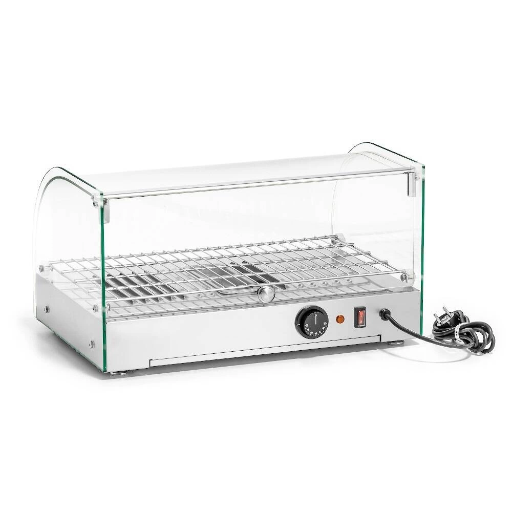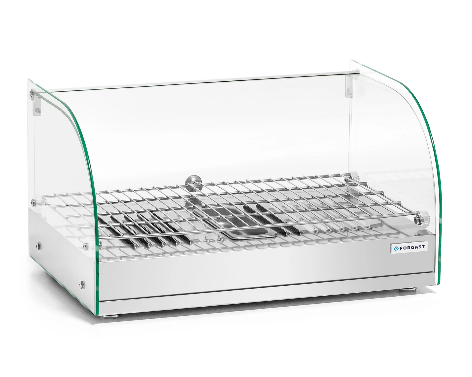 Witryna FORGAST FG09612 została wykonana z połączenia hartowanego szkła oraz stali nierdzewnej, co zapewnia jej wysoką odporność na uszkodzenia i łatwość czyszczenia. Zaokrąglona przednia szyba nadaje urządzeniu nowoczesny wygląd i zwiększa widoczność prezentowanych produktów. Duża tylna szyba umożliwia wygodne uzupełnianie asortymentu i szybki dostęp podczas obsługi klienta. Witryna znajduje szerokie zastosowanie – od prezentacji świeżych wypieków w piekarniach, przez utrzymywanie temperatury przekąsek na stacjach benzynowych, po kawiarnie.