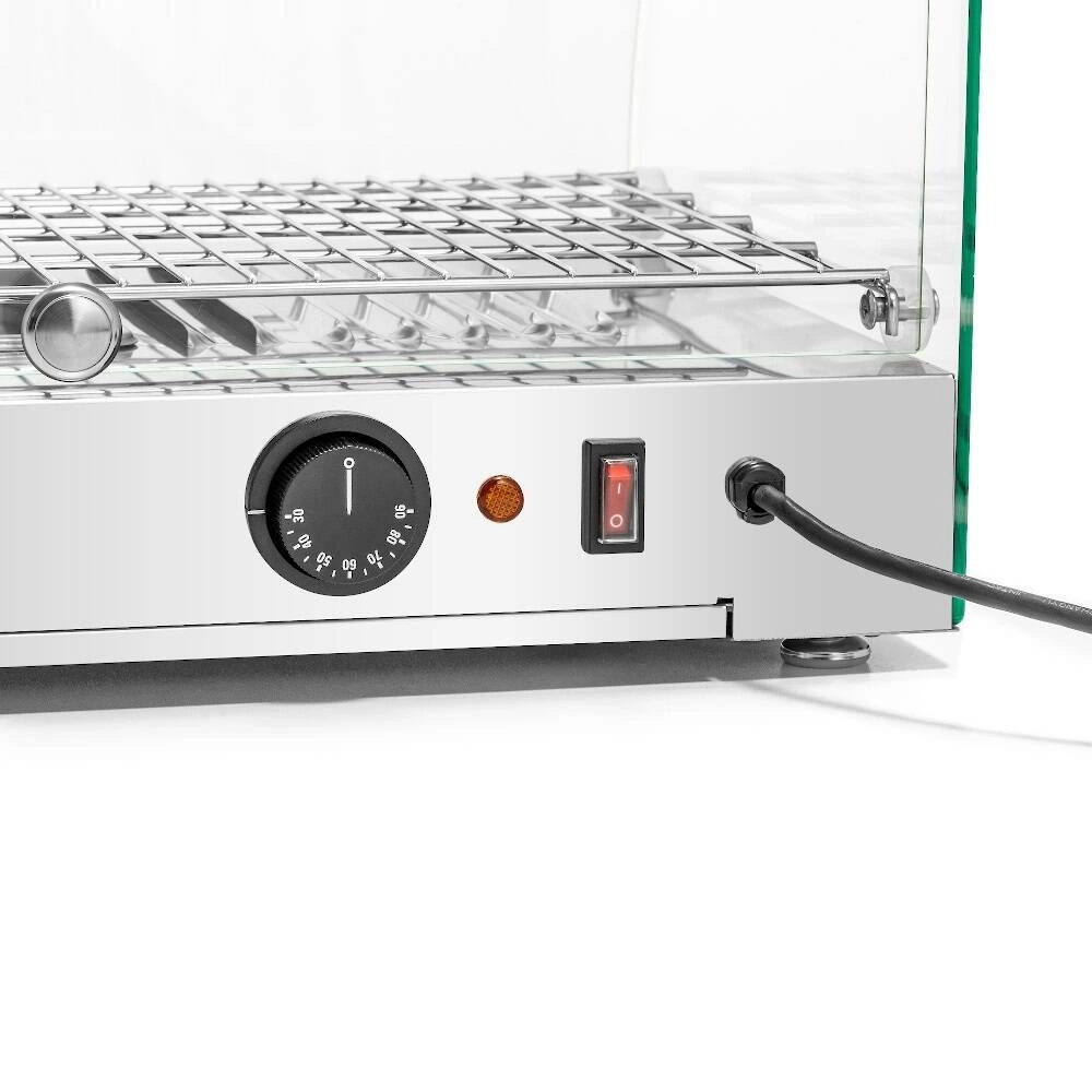 - Regulacja temperatury: 30-90°C – pozwala dostosować poziom ciepła do rodzaju przechowywanych produktów, od delikatnych ciast po gorące przekąski.