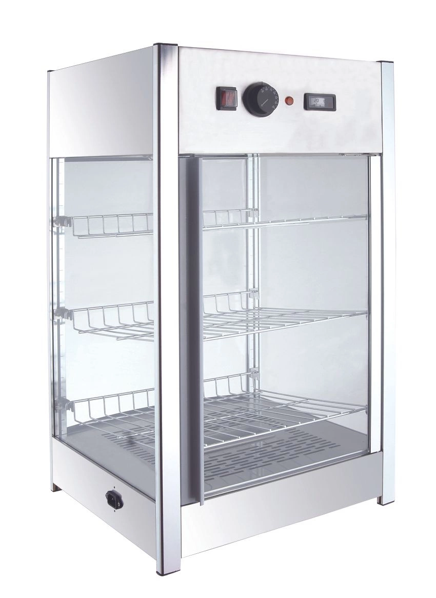 Witryna grzewcza nastawna o pojemności 9 l. Tylne drzwi skrzydłowe, zaokrąglona szyba z przodu. Konstrukcja wykonana ze stali nierdzewnej. Oświetlenie na górze komory. 3 półki o wymiarach 40x33.5 cm. Regulacja półek co 2 cm. Pokrętło regulacji temperatury i termometr analogowy.