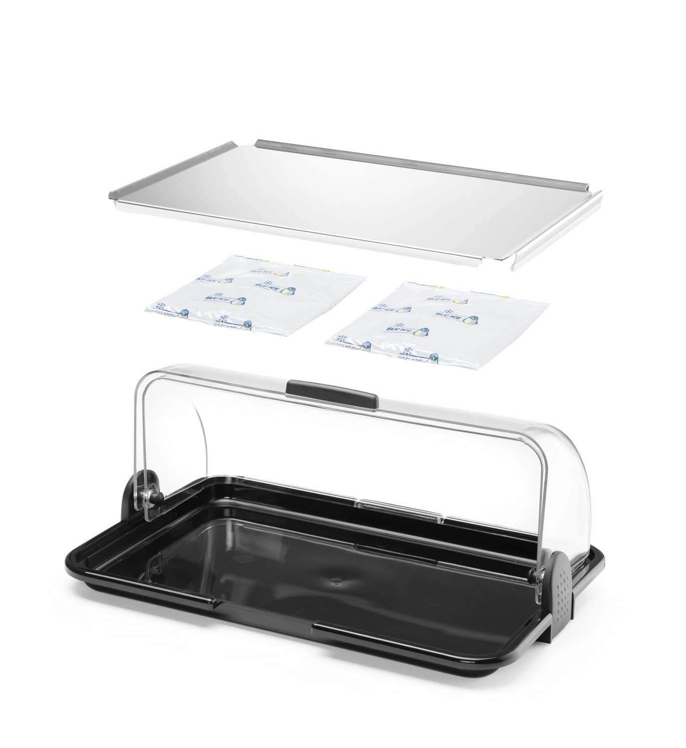 Nadaje się do mycia w zmywarce. W zestawie 2 wkłady żelowe do chłodzenia lub grzania żywności umieszczonej w witrynce.