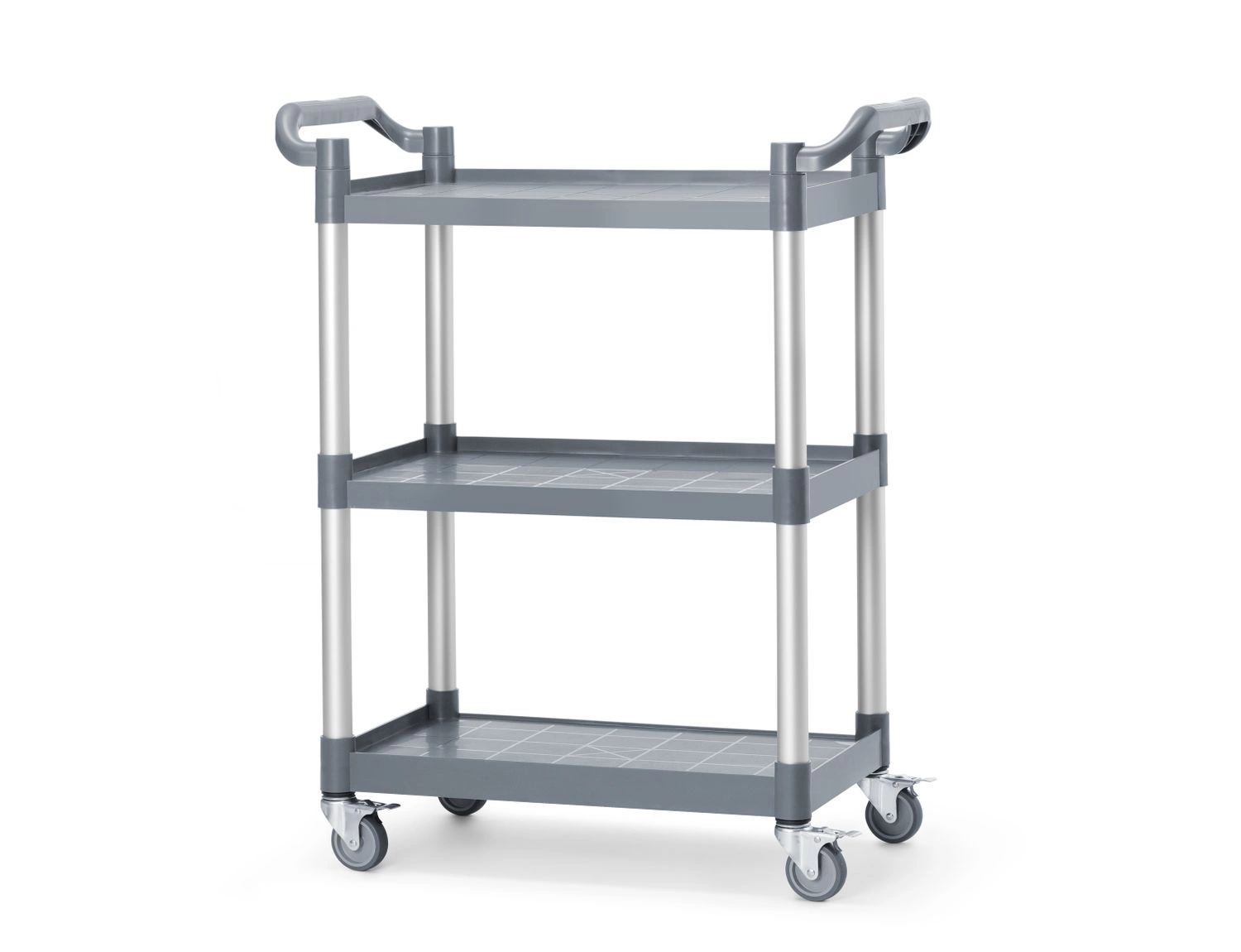 Wózek 3-półkowy z tworzywa do samodzielnego montażu. Maksymalne obciążenie półki do 50 kg przy równomiernie rozłożonym ciężarze. Lekka konstrukcja. 4 kółka skrętne, w tym 2 z hamulcem. Odległość między półkami 34 cm.