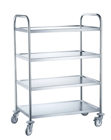 Wózek cateringowy wyposażony w 4 półki wyłożone od spodu materiałem dźwiękochłonnym wykonany ze stali nierdzewnej. Maksymalne obciążenie półek to 40 kg. Wózek rekomendowany jest dla dużej i małej gastronomii, hoteli, przedszkoli, szkół oraz szpitali. Chętnie kupowany jest przez firmy cateringowe oraz domy weselne. Wózek dostarczamy w płaskim opakowaniu do samodzielnego montażu.