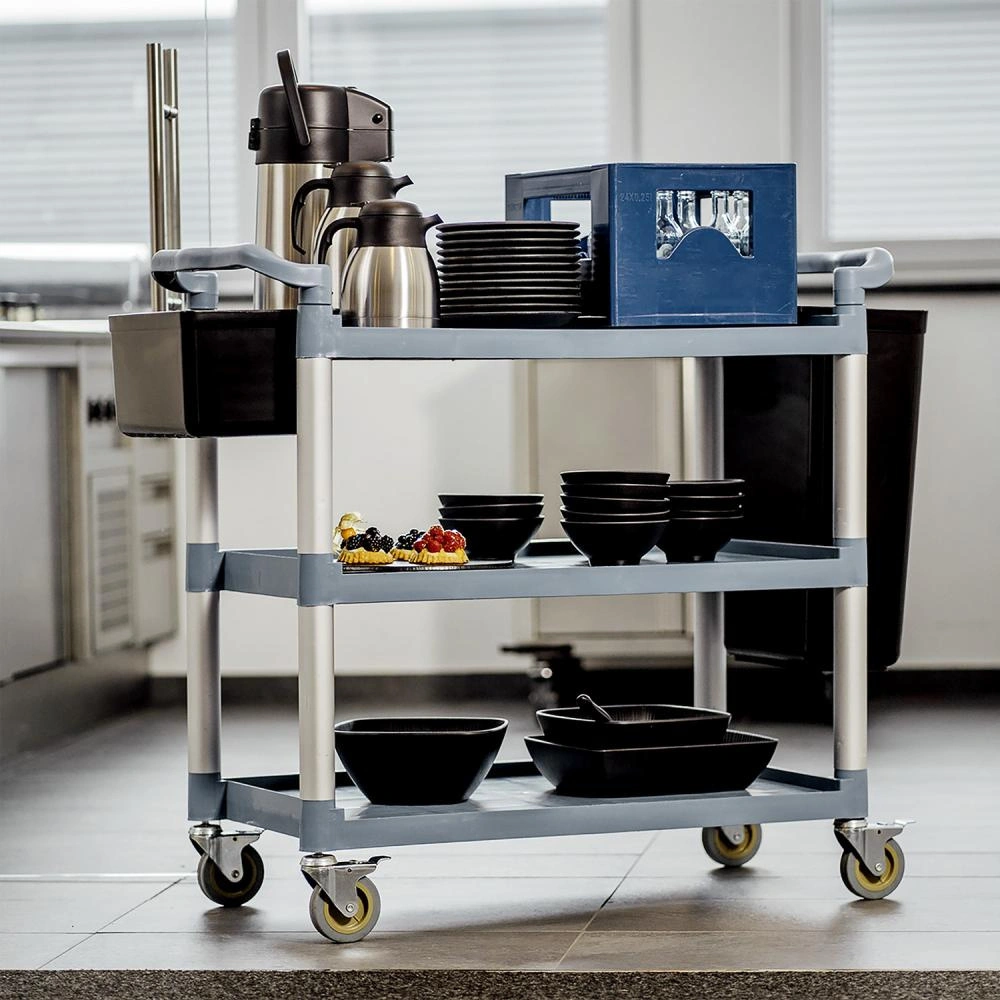 Wózek kelnerski READY, 3-półkowy z tworzywa APS 11945 to profesjonalny sprzęt stworzony z myślą o sprawnym serwowaniu i transporcie naczyń, potraw czy innych akcesoriów w lokalach gastronomicznych. Trwała konstrukcja z aluminium i polipropylenu, trzy pojemne półki oraz cztery kółka z hamulcami czynią ten wózek niezwykle praktycznym rozwiązaniem zarówno do restauracji, hoteli, jak i placówek cateringowych.