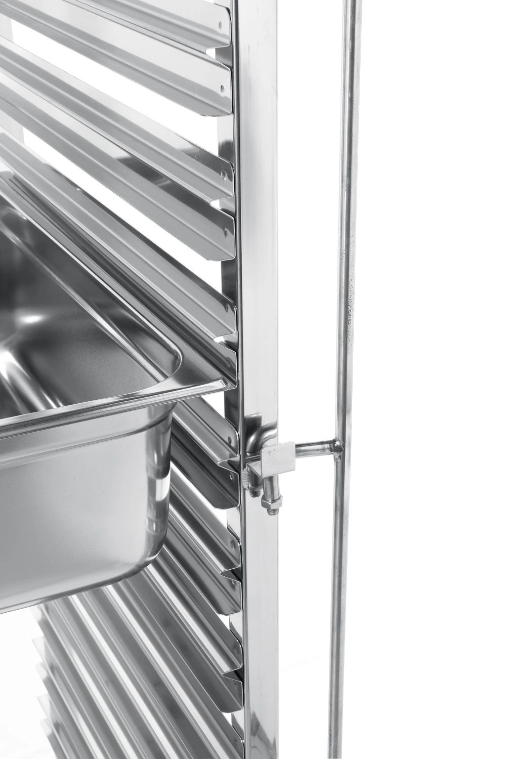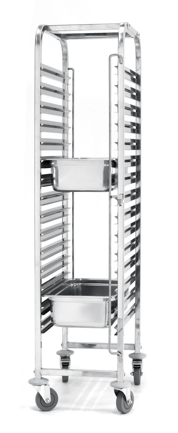 Wózek wykonany ze stali chromowej przeznaczony do transportu tac i pojemników GN. Wózek wymaga samodzielnego montażu. 4 kółka skrętne (w tym 2 z hamulcami). Wózek posiada obustronne zabezpieczenie przed wypadnięciem pojemników GN. Pojemność wózka 15 GN 1/1.