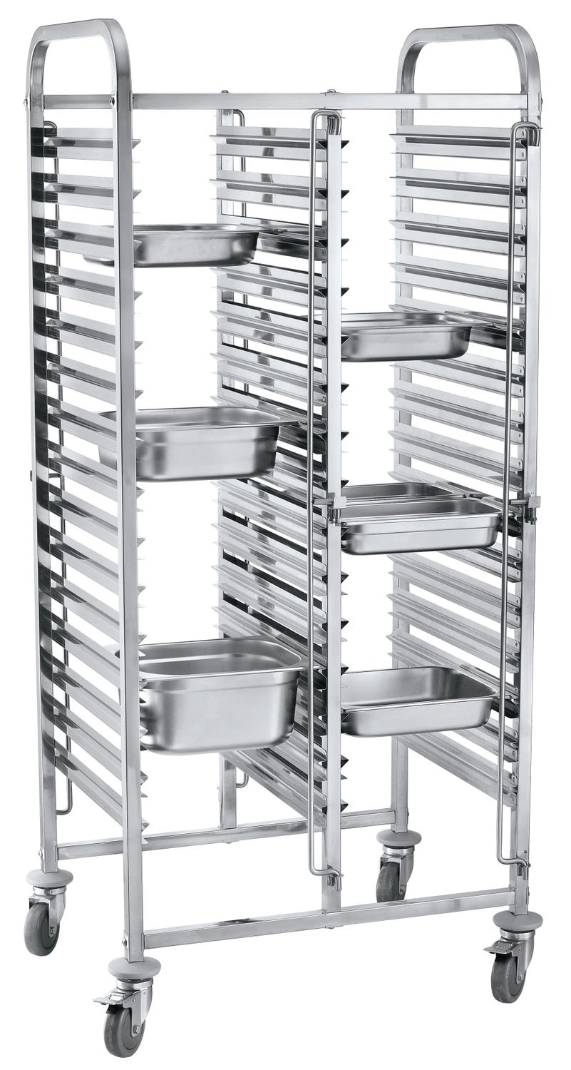 Wózek podwójny do transportu pojemników GN wyposażony w 4 skrętne kółka (w tym 2 z hamulcami). Możliwość przewożenia do 30 pojemników GN 1/1 - odległość między półkami wynosi 80mm. Wózek posiada obustronne zabezpieczenie przed wysunięciem się pojemników. Wsunięcie pojemników jeden w drugi ułatwia ich magazynowanie.