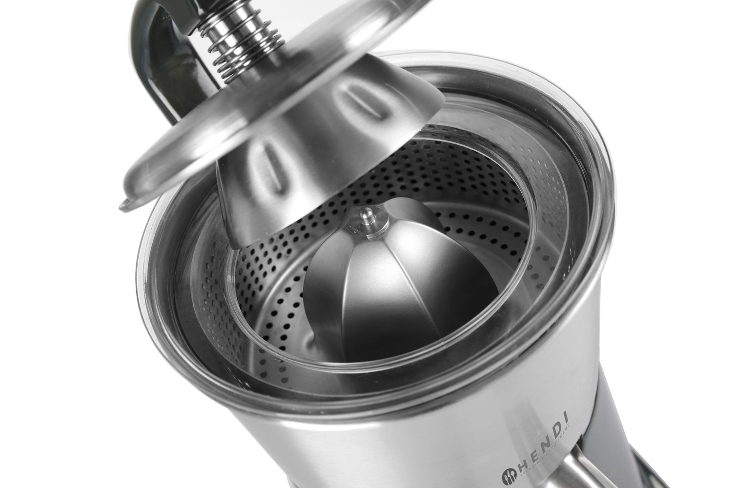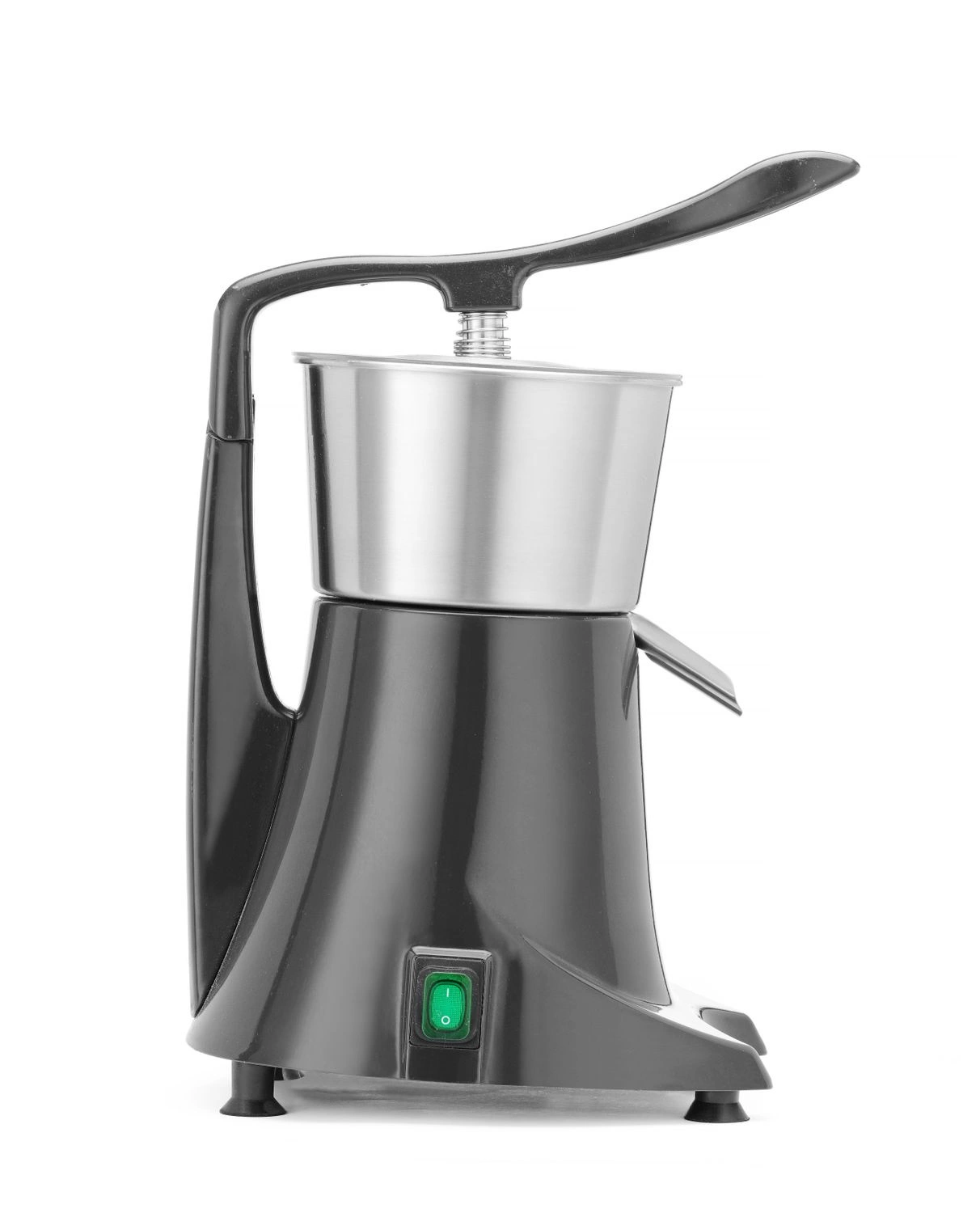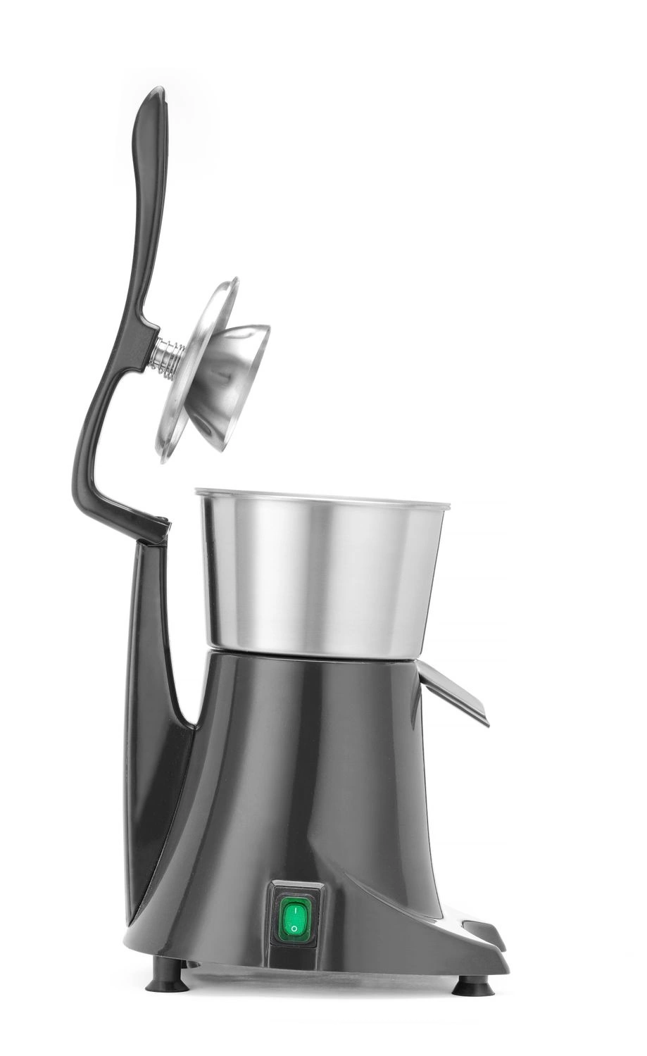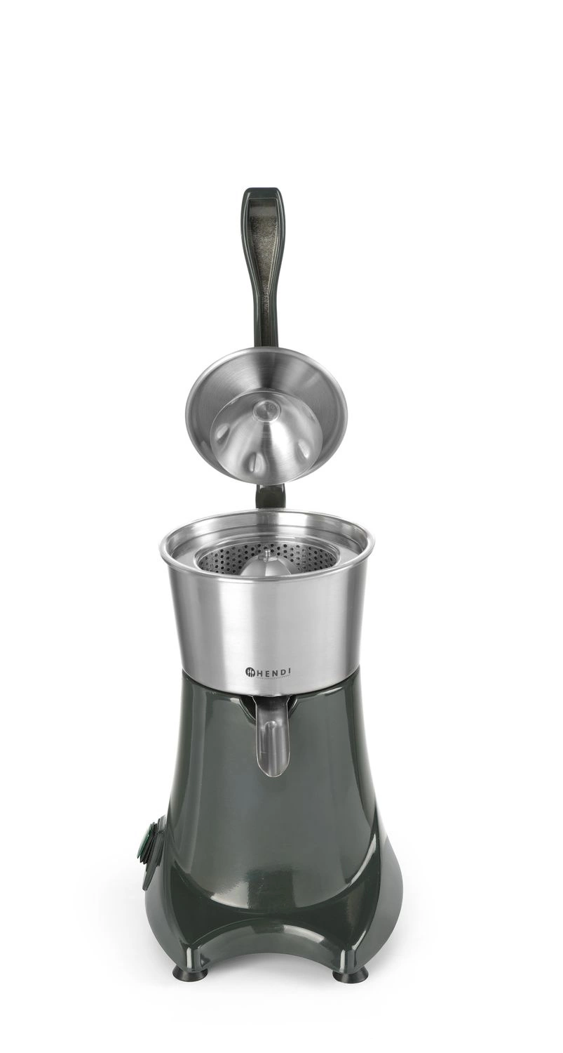 Wyciskarka do owoców cytrusowych z pokrywą docuiskową. Pokrywa dociskowa zapewnia łatwą i bezpieczną obsługę. Wyjmowany pojemnik na sok i nakładka stożkowa z sitkiem wykonane ze stali nierdzewnej. Osłona antyrozpryskowa. Prędkość obrotów - 980 obr./ min