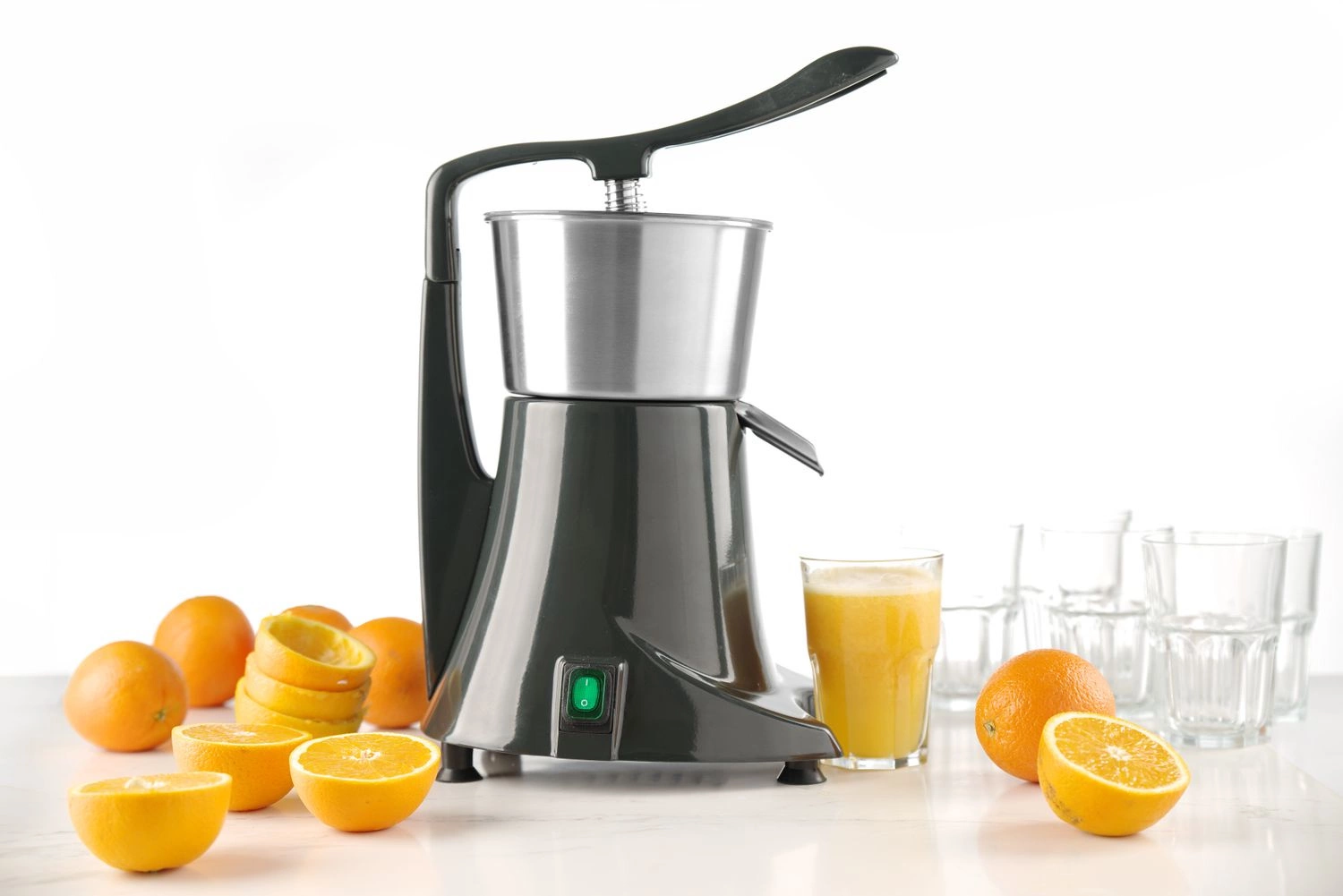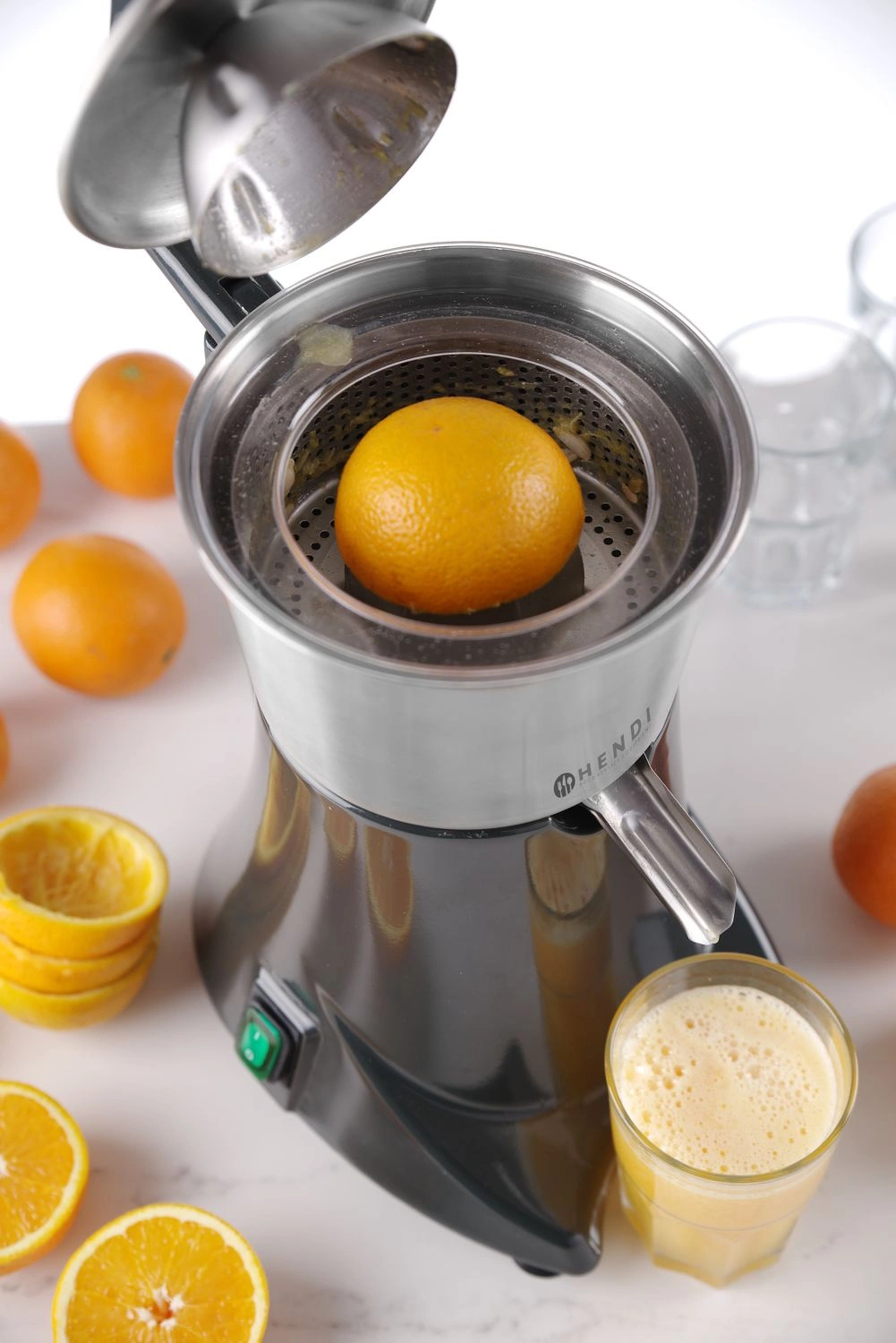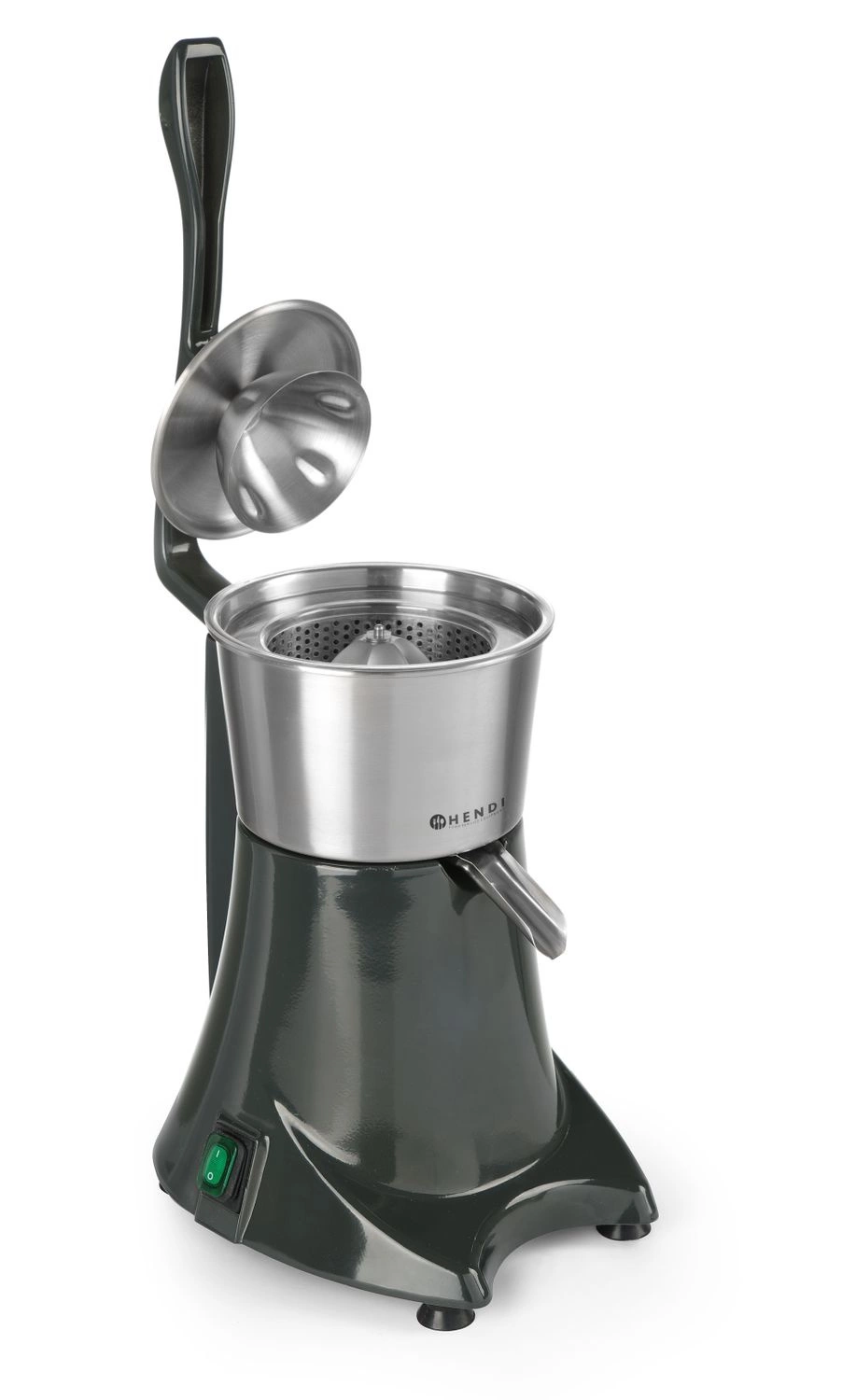 Wyciskarka do owoców cytrusowych z pokrywą docuiskową. Pokrywa dociskowa zapewnia łatwą i bezpieczną obsługę. Wyjmowany pojemnik na sok i nakładka stożkowa z sitkiem wykonane ze stali nierdzewnej. Osłona antyrozpryskowa. Prędkość obrotów - 980 obr./ min