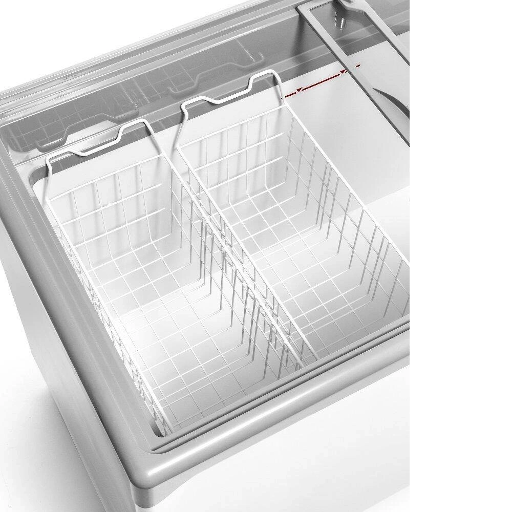 Wnętrze zamrażarki wykonane zostało z gładkiej blachy aluminiowej, dzięki czemu łatwo utrzymać higienę i szybko przeprowadzić rozmrażanie czy mycie. Przegroda oraz dwa kosze umożliwiają segregację i wygodny dostęp do najczęściej używanych produktów, co sprawdza się szczególnie w cukierniach, lodziarniach czy na zapleczach restauracji.