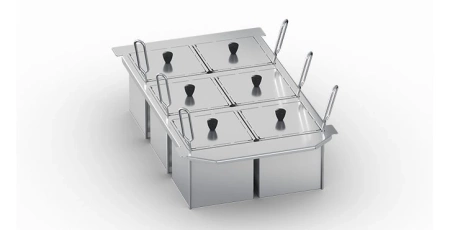 Zestaw idealnie sprawdza się w intensywnie pracujących kuchniach gastronomicznych, gdzie kluczowe jest szybkie i jednoczesne przygotowanie różnych składników bez ryzyka mieszania smaków. Dzięki ramie, kosze są stabilnie osadzone nad kadzią, co zwiększa ergonomię i bezpieczeństwo pracy.
