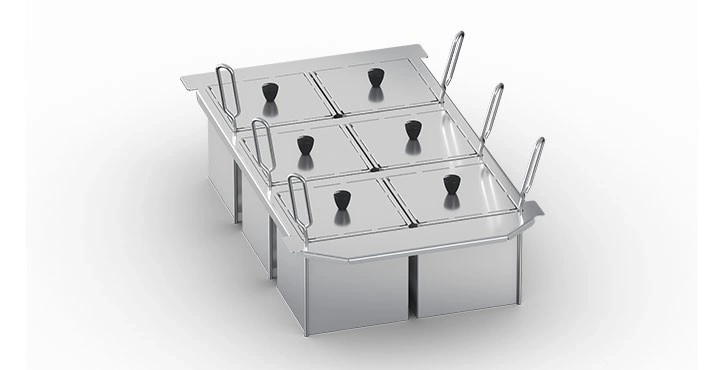 Zawartość zestawu: 6 nieperforowanych koszy porcjujących 1/6 GN, pokrywki + rama montażowa